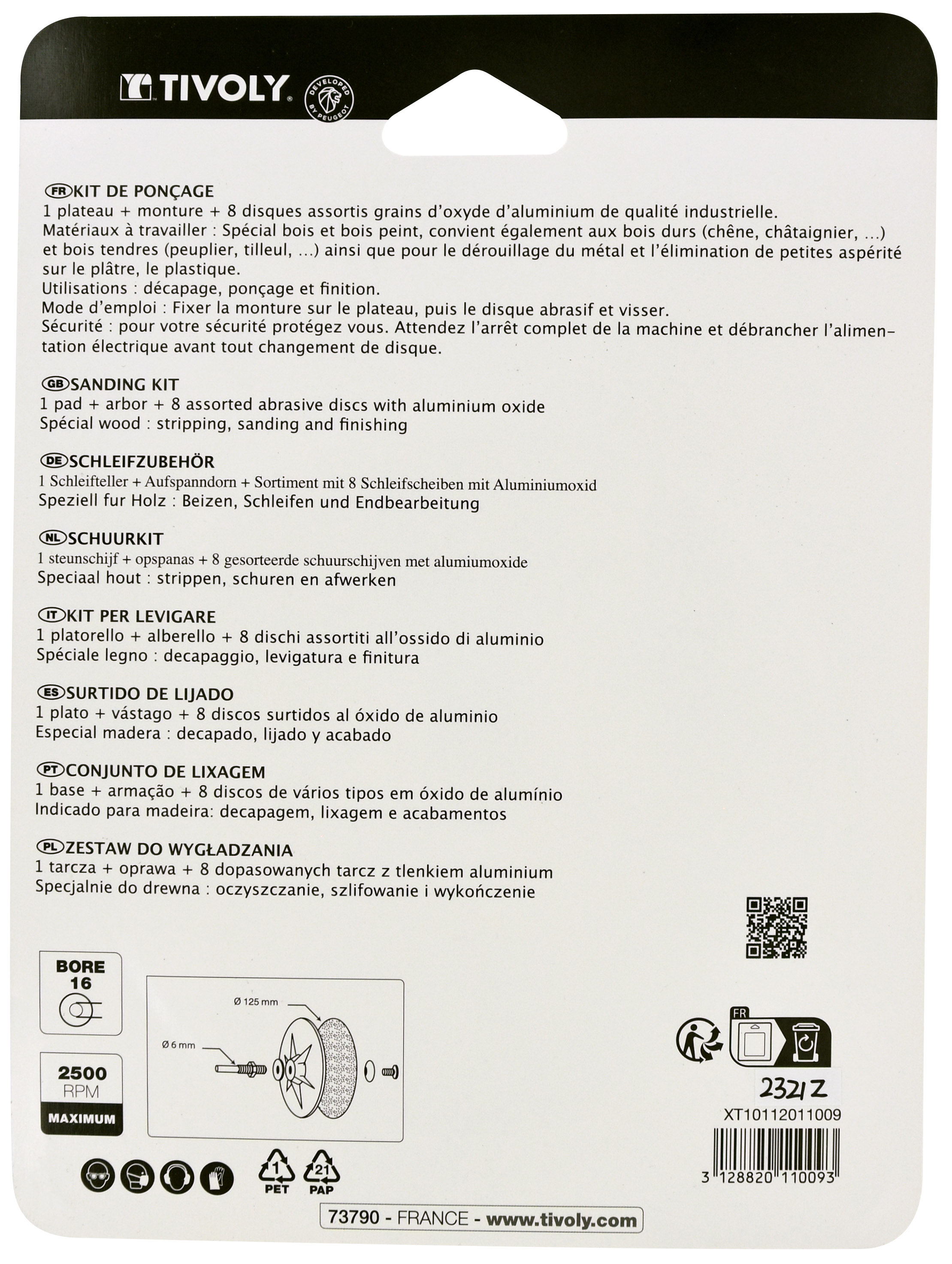 Découvrez 10 pièces -1 plateau ponceur Ø 125mm + Monture + 8 abrasifs TIVOLY - XT10112011009 disponible à l'achat
