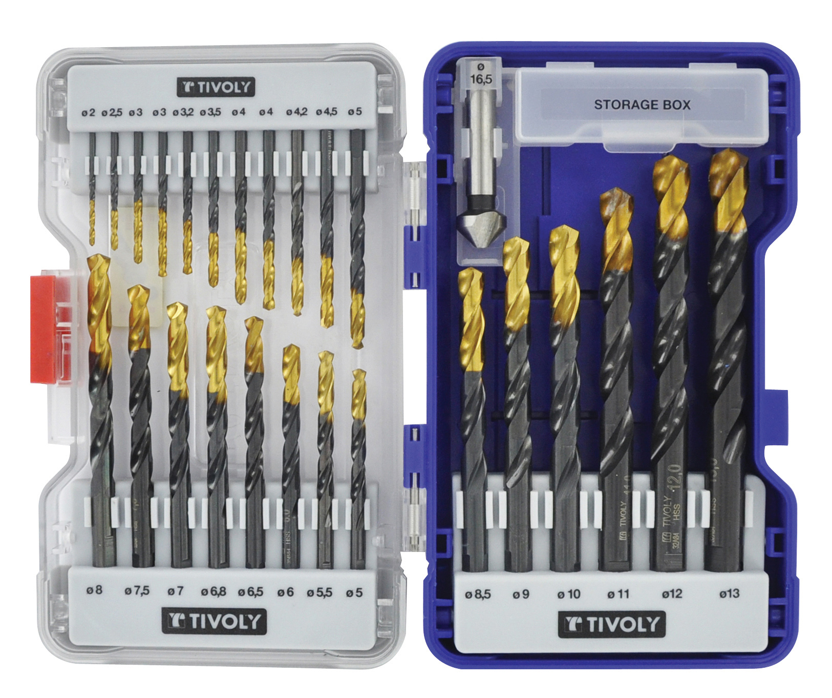 26 pièces -25 forets HSS STEAM revêtus TiN taillés meulés pointe en croix queue à 3 méplats Ø 2 à 13mm + 1 fraise à noyer HSS Ø 15mm TIVOLY - 11453170007