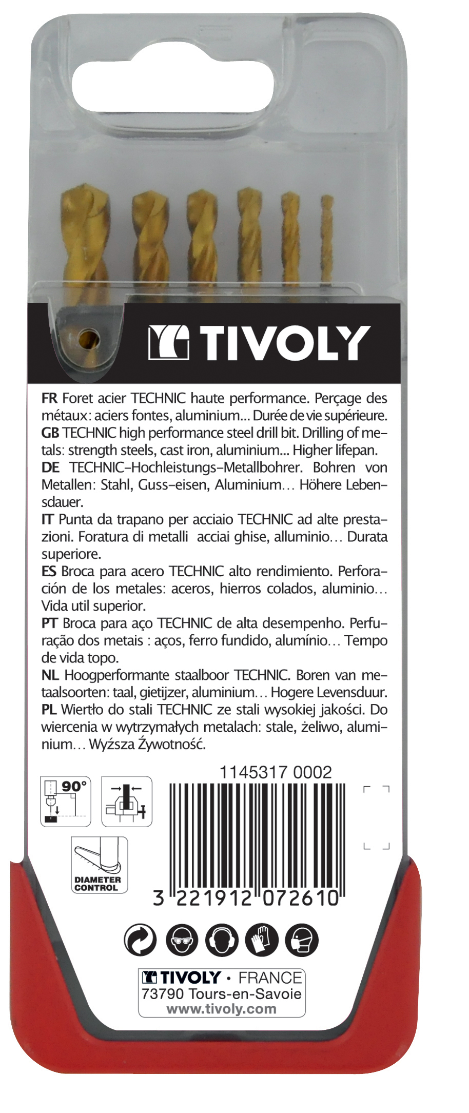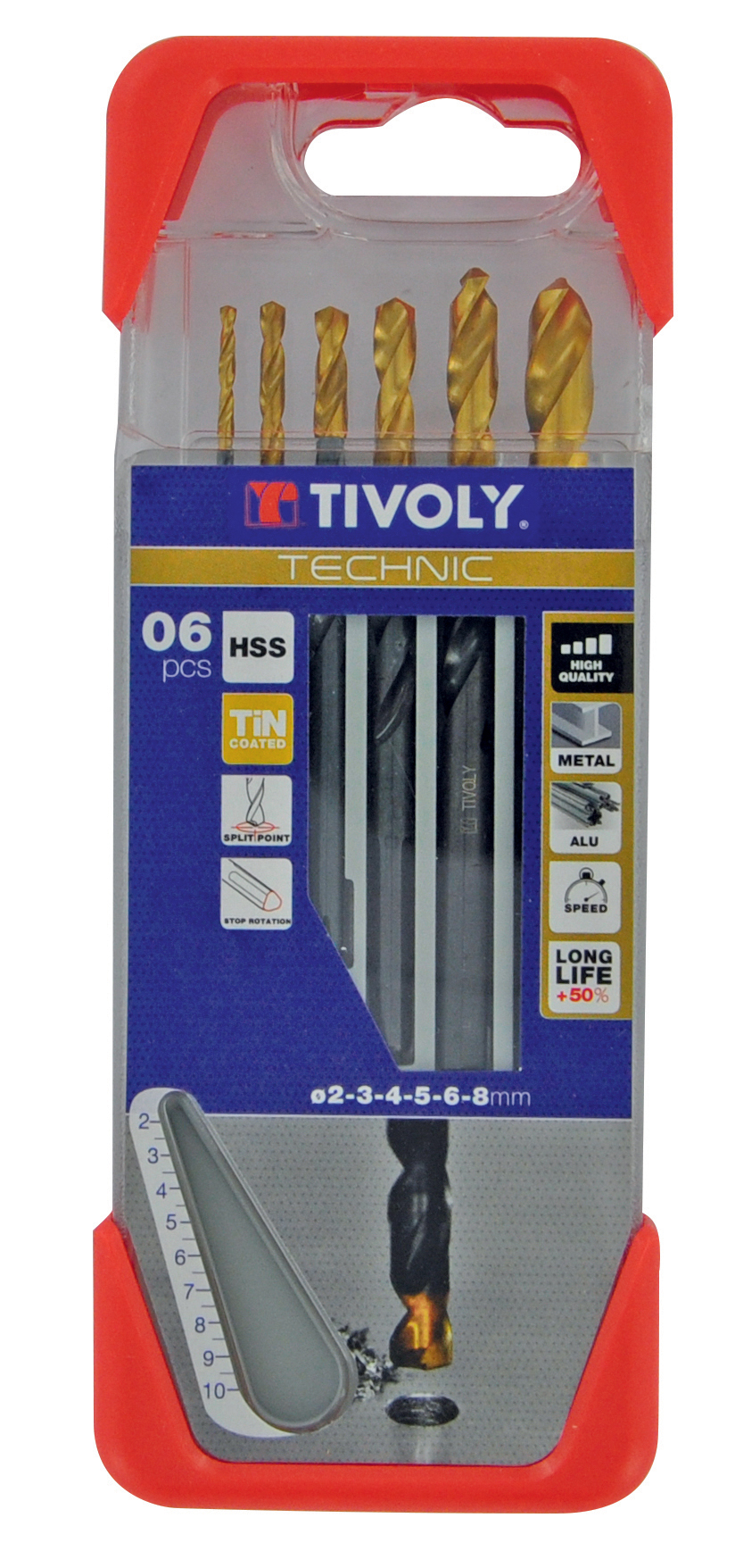 Découvrez 6 forets métaux HSS STEAM revêtus TiN taillés meulés pointe en croix queue à 3 méplats Ø 2 à 8mm TIVOLY - 11453170002 disponible à l'achat