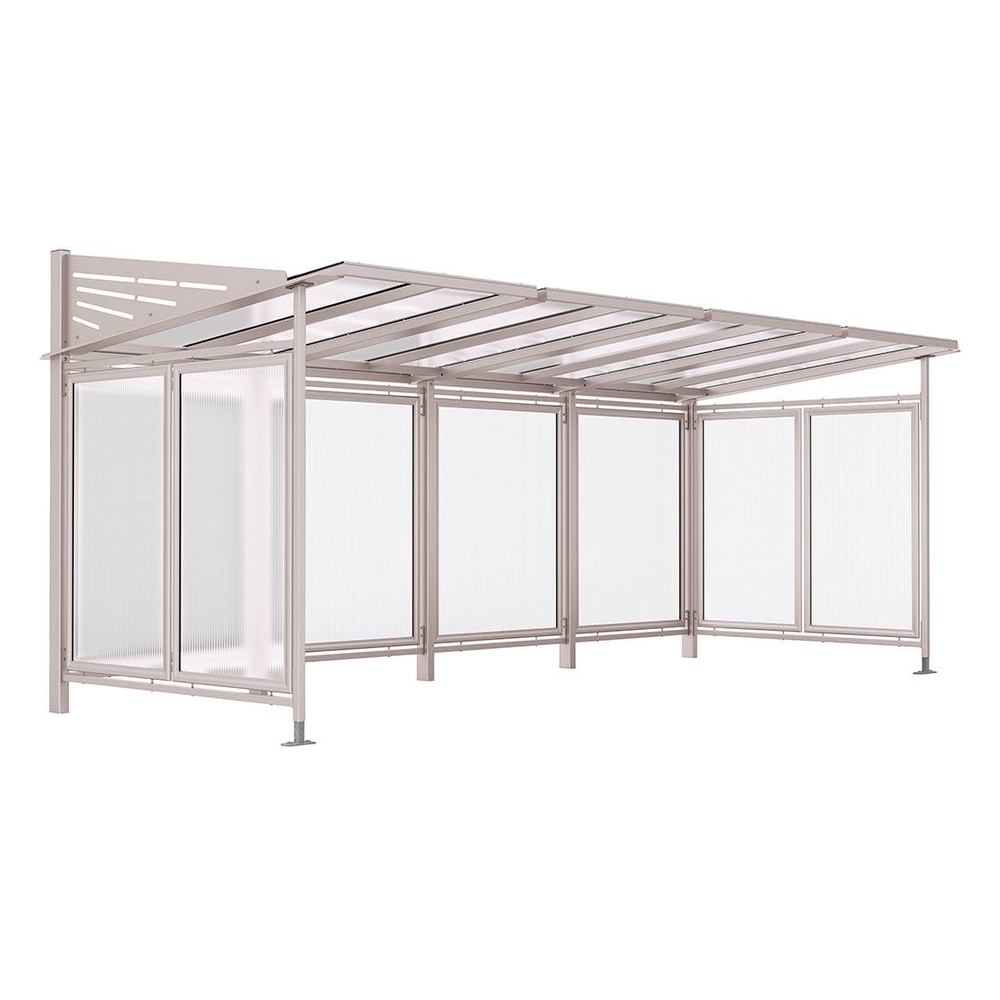 L'abri est modulaire et extensible à l'infini grâce à un module complémentaire de 1300 mm de largeur. La fixation se réalise par scellement direct avec des poteaux de façade montés sur platines galvanisées, équipés de pieds réglables en hauteur pour une installation stable et adaptable.