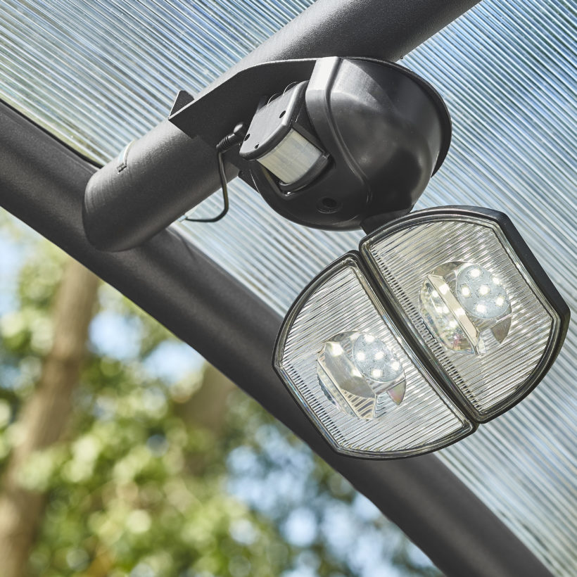 Facile à monter en seulement 4 heures à deux, il se distingue par son assemblage invisible. Sa structure robuste est réalisée en tube de 60 mm d'épaisseur avec un toit en polycarbonate alvéolaire de 6 mm. Les cloisons en PMMA garantissent une protection supplémentaire et une luminosité optimale.