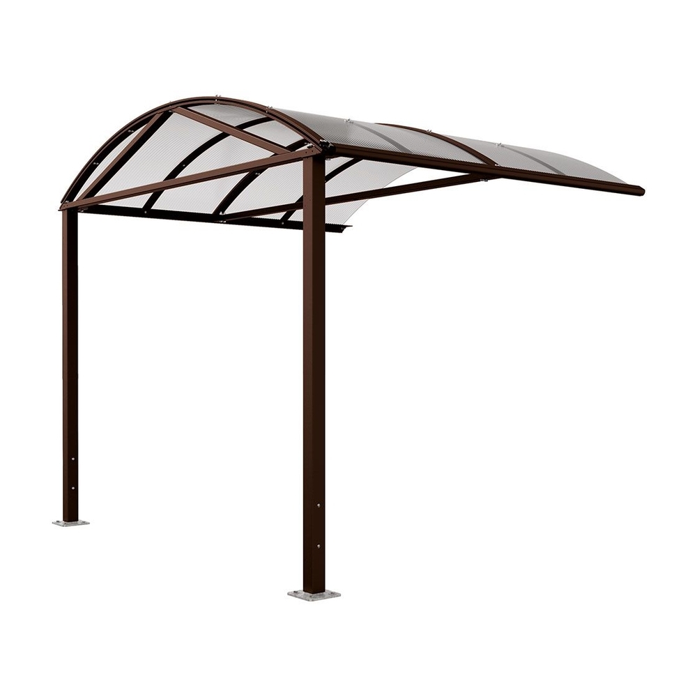 La structure est composée de poteaux en acier galvanisé de 80 x 80 mm, assurant robustesse et durabilité. La toiture est constituée de traverses en acier de 60 x 40 mm, accompagnées de gouttières en aluminium peint selon la palette de coloris proposée, dont le RAL8017. La voûte est réalisée en polycarbonate alvéolaire de 10 mm d'épaisseur, traité anti-UV pour une meilleure résistance aux rayons solaires et une longévité accrue.