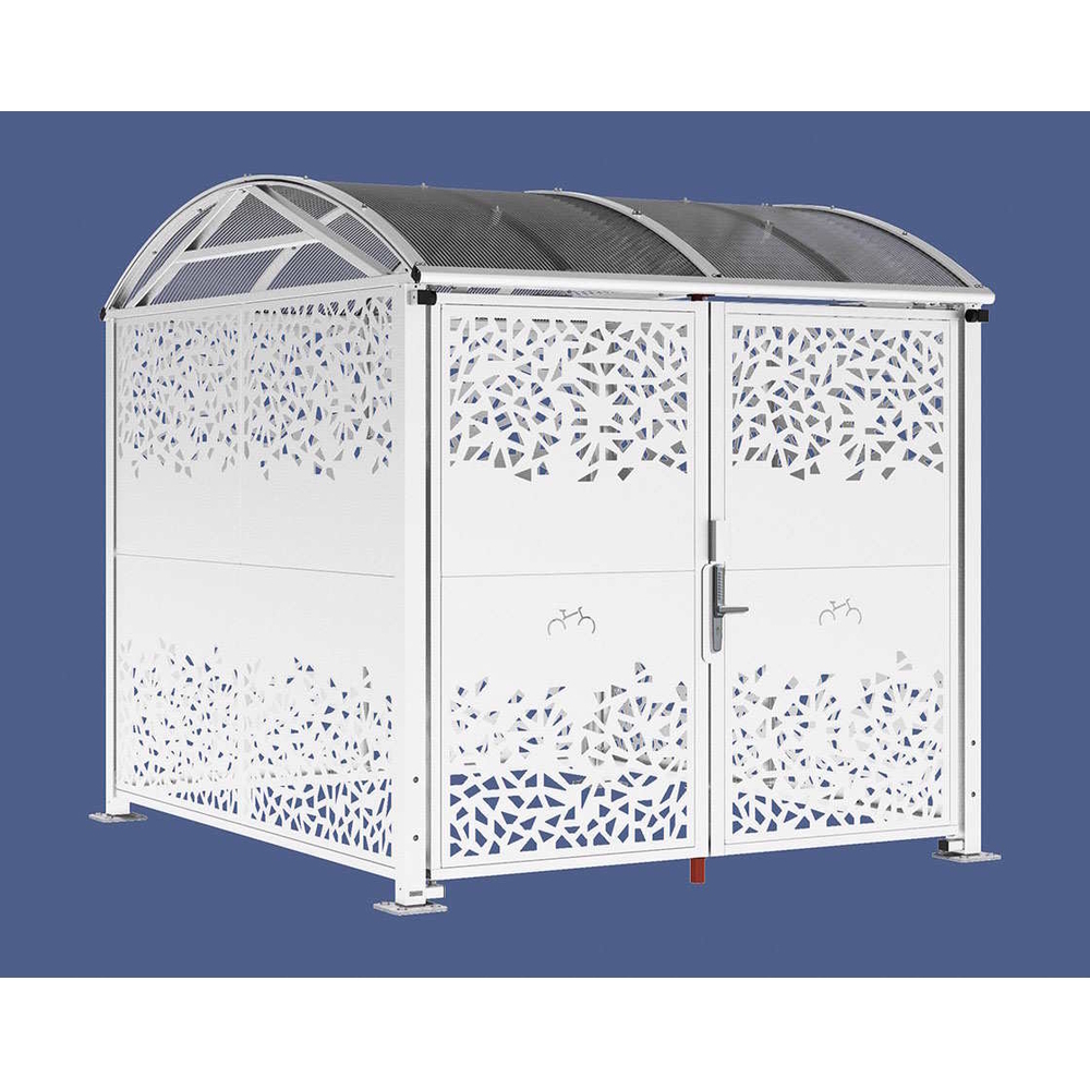 Découvrez l'abri vélos et motos Voûte sécurisé "L" avec tôle décorative, une solution idéale pour protéger vos deux-roues.