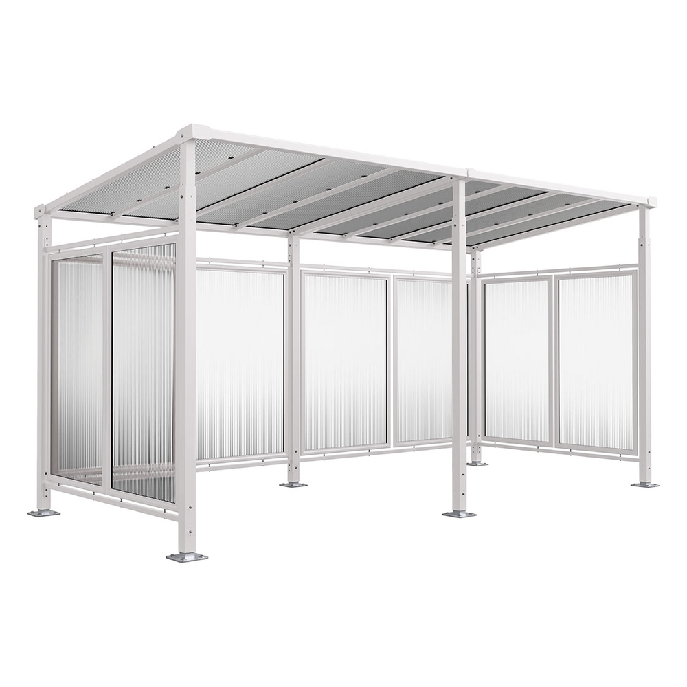 Avec des dimensions de 2500 mm de largeur, 2880 mm de hauteur et 2434 mm de profondeur, l'abri est construit avec des poteaux en acier de 80 x 80 mm. Sa toiture est composée de traverses en tube d'acier de 60 x 60 mm, recouvertes de panneaux en polycarbonate alvéolaire de 10 mm d'épaisseur, traités anti-UV pour une durabilité accrue. La finition est disponible en monochrome ou bicolore selon le choix de coloris. En option, des bardages de fond et latéraux, ainsi qu'un coupe-vent de toiture, peuvent être ajoutés pour une protection renforcée. Ce produit est également éligible au programme Alvéole Plus.