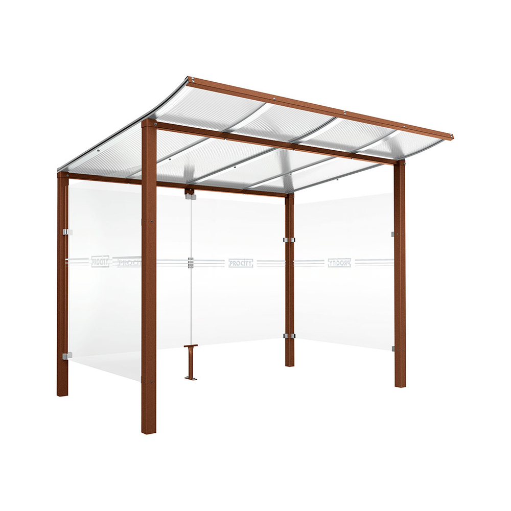Les bardages de fond et latéraux sont en verre sécurisé d'épaisseur 5 mm, avec une finition Aspect Corten qui apporte une esthétique soignée et une harmonie à l'espace urbain. Des options supplémentaires sont disponibles, telles que les bardages en stratifié compact de 13 mm (finition chêne clair ou acajou), bavettes coupe-vent latérales, accroche motos, ainsi que des supports et appuis cycles.