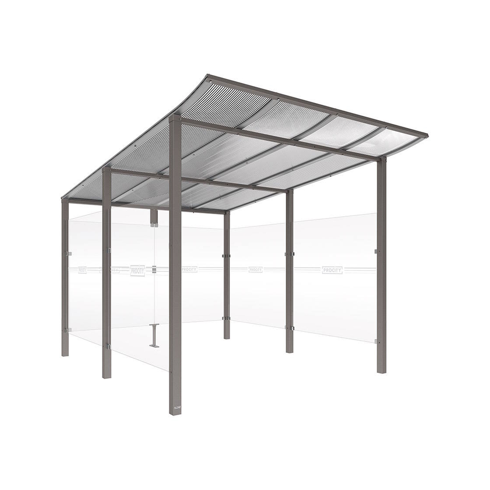 L’abri mesure 2500 mm de large et 2250 mm de haut, avec deux profondeurs disponibles : 2000 mm et 3400 mm. Sa structure est composée de poteaux en tube acier de 70 x 70 mm, tandis que la toiture allie profilés en aluminium anodisés et panneaux en polycarbonate alvéolaire de 10 mm, traités anti-UV. En plus de sa finition peinte sur galvanisé, l'abri propose des bardages de fond et latéraux comme options, renforçant ainsi sa fonctionnalité tout en s'intégrant harmonieusement dans l'environnement urbain.