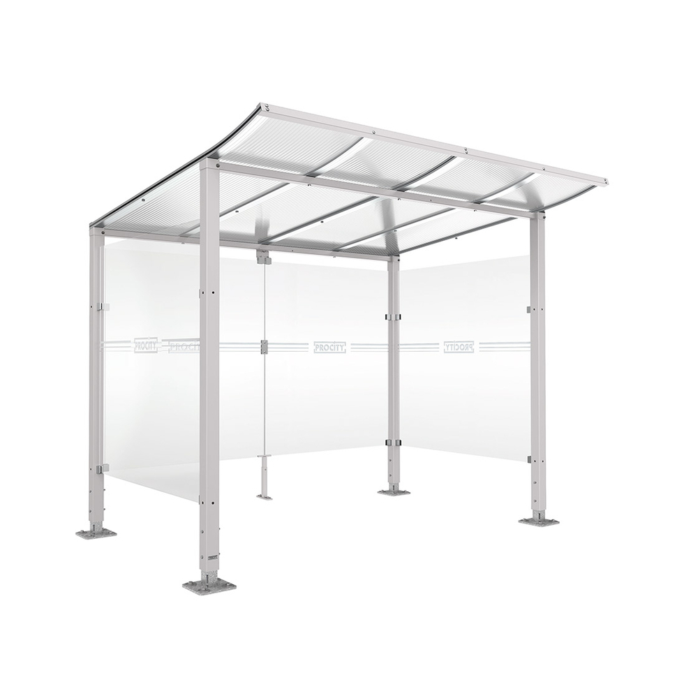 L’abri est livré avec des options de bardages en verre sécurisé de 5 mm d’épaisseur pour le fond et les côtés, apportant à la fois protection et esthétique. La pose se fait par scellement direct ou sur platines réglables en hauteur jusqu’à 80 mm, facilitant l’adaptation au terrain.
