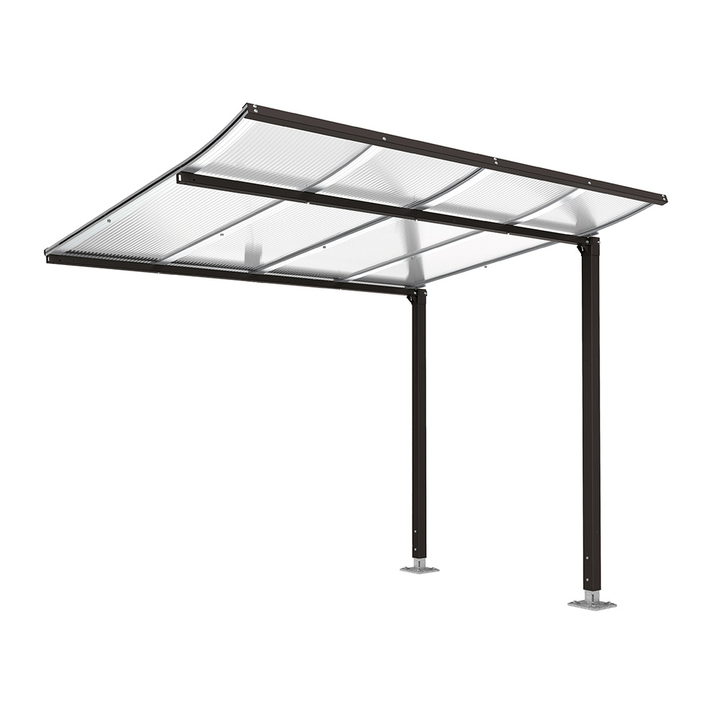 Il mesure 2500 mm de largeur et 2250 mm de hauteur, avec deux profondeurs proposées : 2000 mm et 3400 mm. La toiture est constituée de profilés en aluminium anodisés et de panneaux en polycarbonate alvéolaire de 10 mm d’épaisseur, traités anti-UV. L'installation peut se faire par scellement direct ou sur platines, et divers accessoires tels que des bardages, coupe-vent et supports pour vélos sont disponibles.