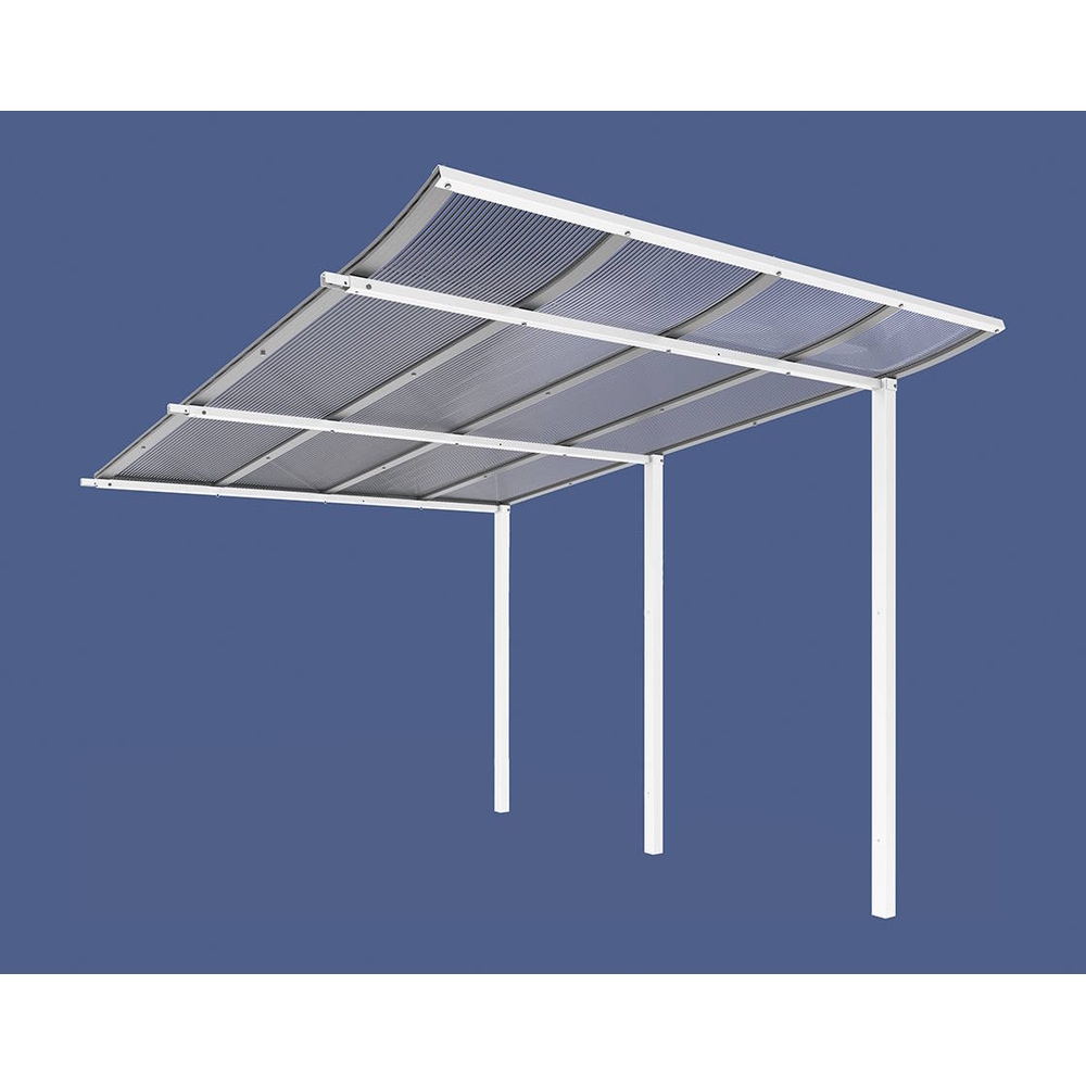 Toiture : profilés en aluminium anodisés, traverses en tube acier 40 x 40 mm et panneaux en polycarbonate alvéolaire épaisseur 10 mm traité anti-UV