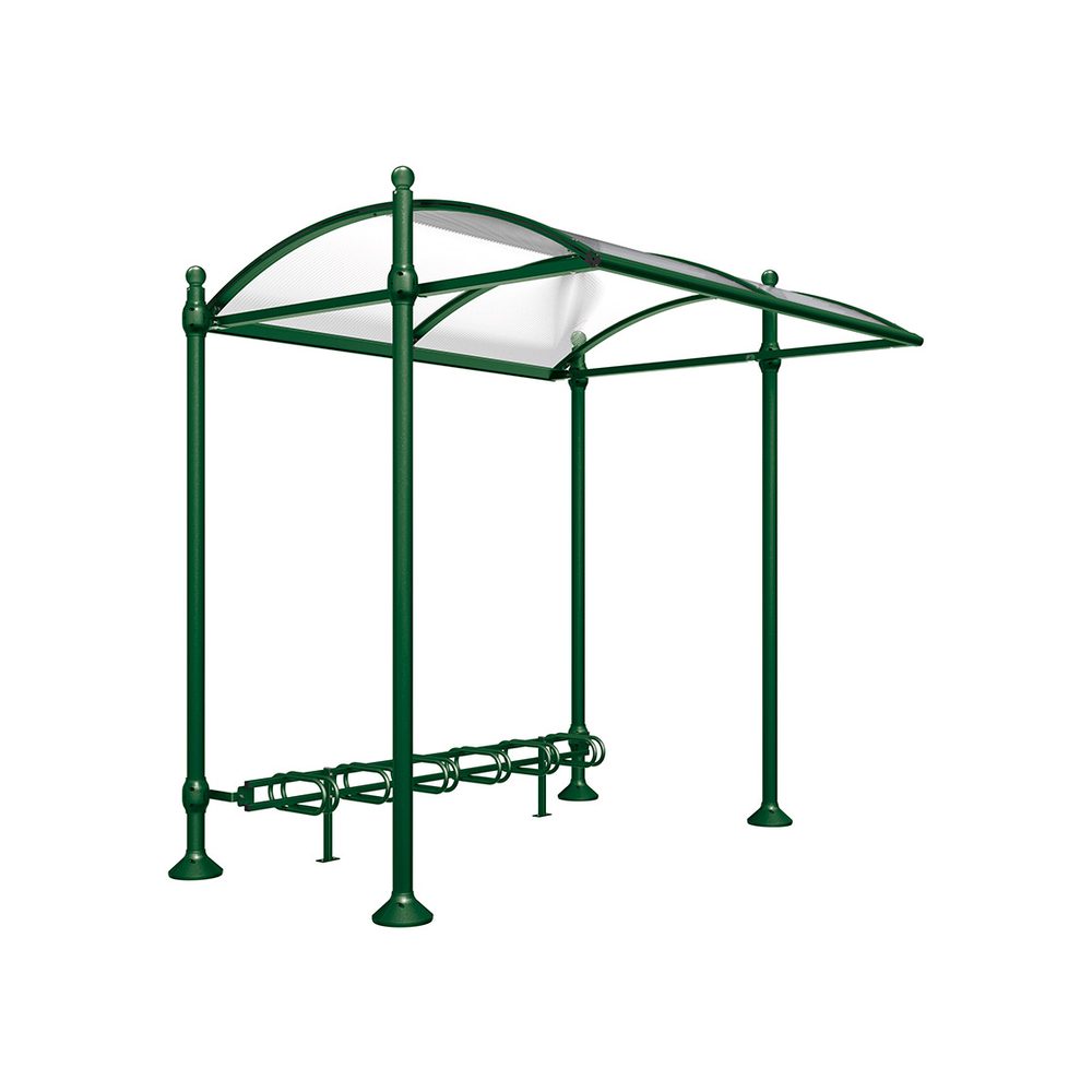 Pour personnaliser l'esthétique, quatre modèles de pommeaux décoratifs sont disponibles : City, Agora, Boule ou Inox brossé, avec des colliers et embases décoratives en aluminium moulé. Le support cycles 6 places est fourni, fabriqué en acier galvanisé peint dans la couleur de l’abri.