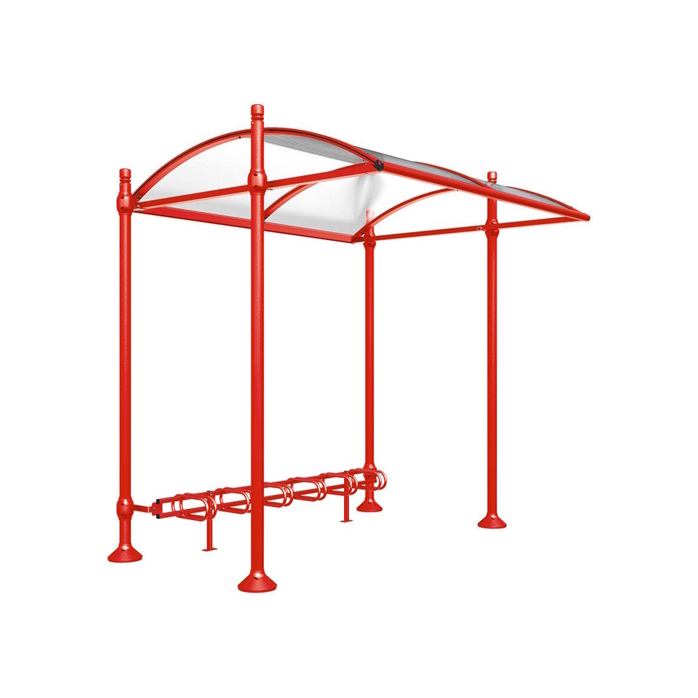 L'abri propose également un module complémentaire d'extension de 2613 mm de largeur permettant d'augmenter la capacité de stationnement. Quatre modèles de pommeaux décoratifs au choix (City, Agora, Boule, Inox brossé) permettent de personnaliser l'esthétique de l'abri. Les colliers et embases décoratives sont en aluminium moulé, garantissant une finition élégante.