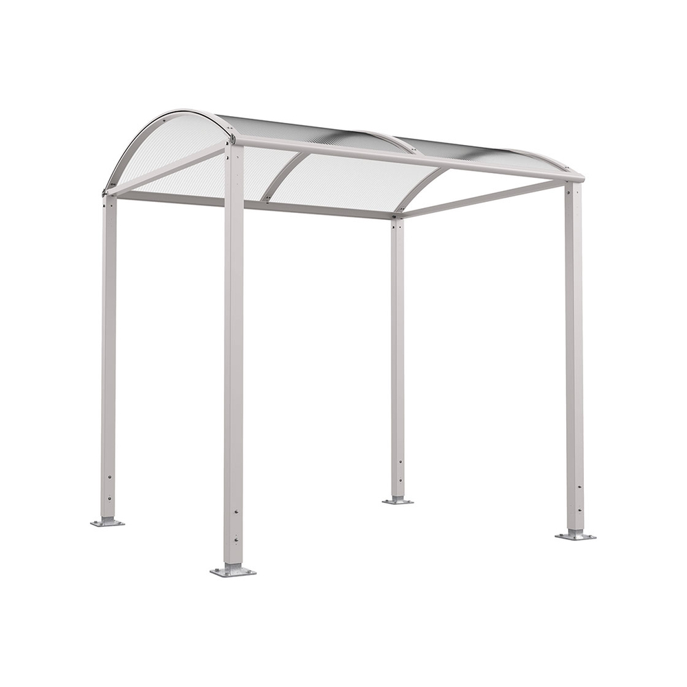Ses dimensions sont de 2500 mm de largeur, 2635 mm de hauteur et 2090 mm de profondeur, avec une capacité d’accueil allant jusqu’à 6 vélos selon le type de support choisi. La structure est constituée de poteaux en acier galvanisé de section 80 x 80 mm, assurant robustesse et durabilité. La toiture repose sur des traverses en tubes aluminium 40 x 60 mm et des gouttières en profilé aluminium 50 x 30 mm, le tout peint selon divers coloris RAL dont le RAL7044. La voûte est réalisée en polycarbonate alvéolaire de 6 mm d’épaisseur, offrant une protection anti-UV.