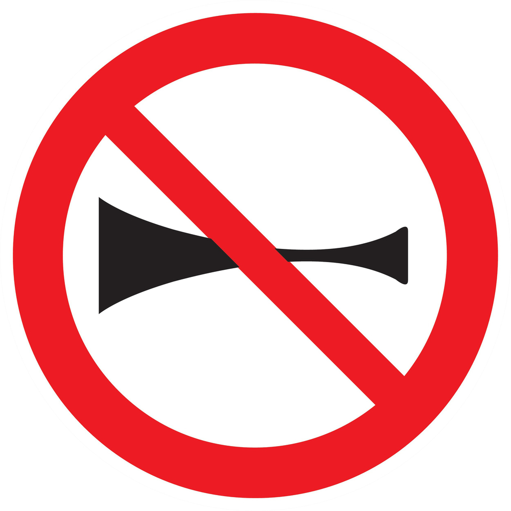 Adhésif vinyle autocollant de forme circulaire, diamètre 300 mm, indiquant l'interdiction de klaxon. Le marquage est réalisé par impression thermique sur un adhésif blanc brillant avec une colle renforcée.