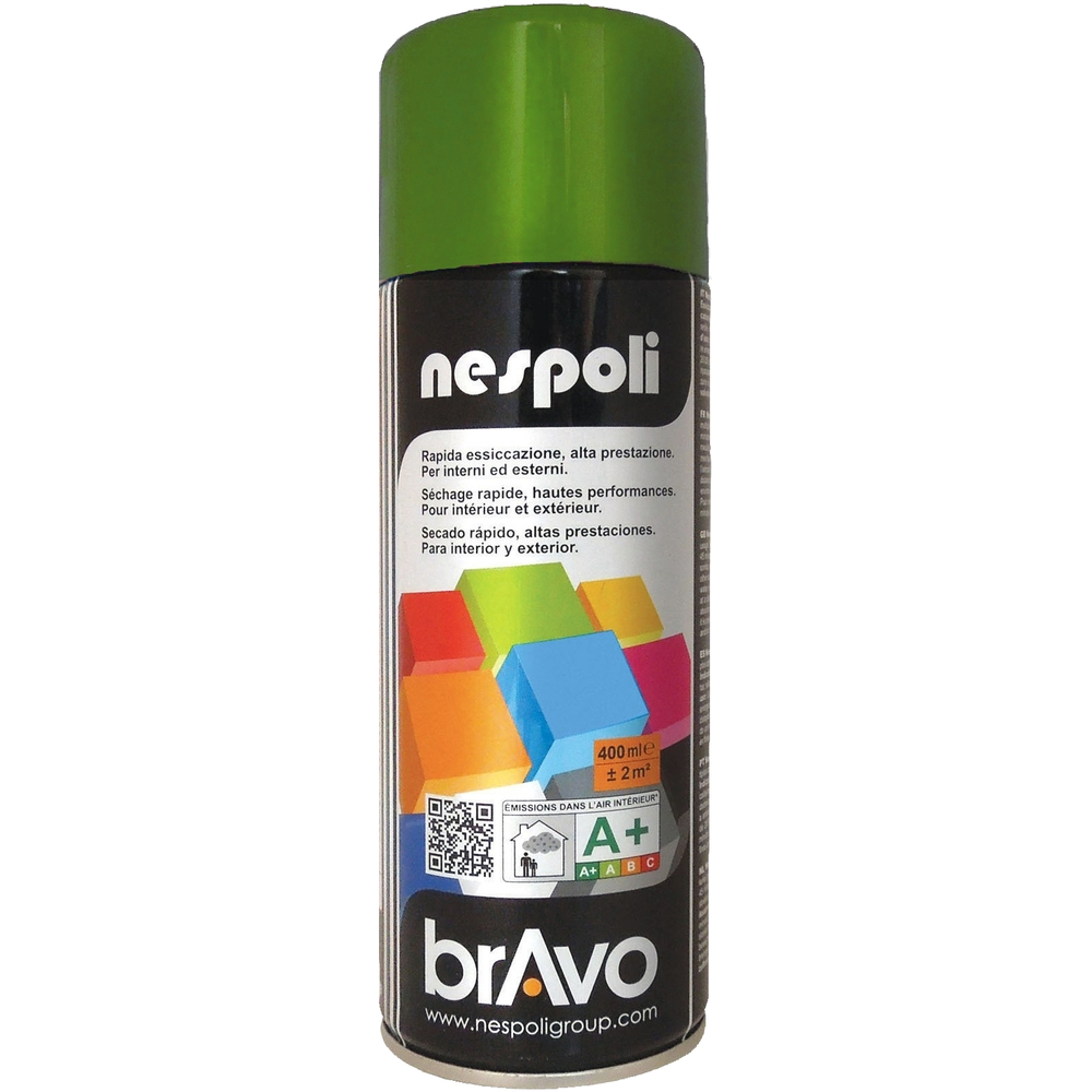 L'aérosol de peinture NESPOLI se présente en format de 400 ml et offre un fini satiné. Il est classé niveau COV A+, garantissant une qualité de l'air intérieur améliorée. Ce produit est conçu pour résister aux conditions extérieures tout en offrant un rendu esthétique dynamique grâce à sa teinte vert olivier.