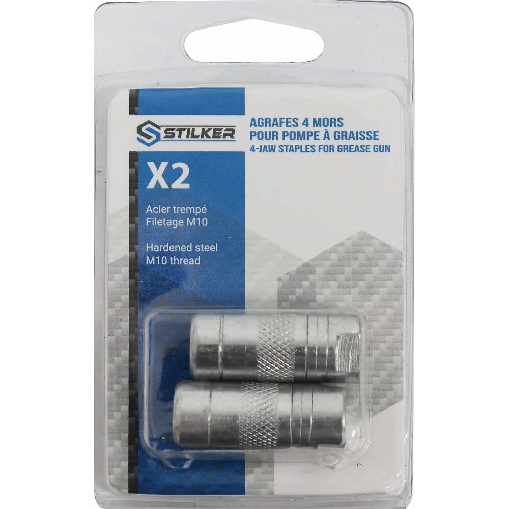 Cette agrafe est équipée de quatre mors pour assurer une fixation solide et sécurisée. Elle est conçue avec un filetage M10, garantissant une compatibilité avec plusieurs équipements de graissage.