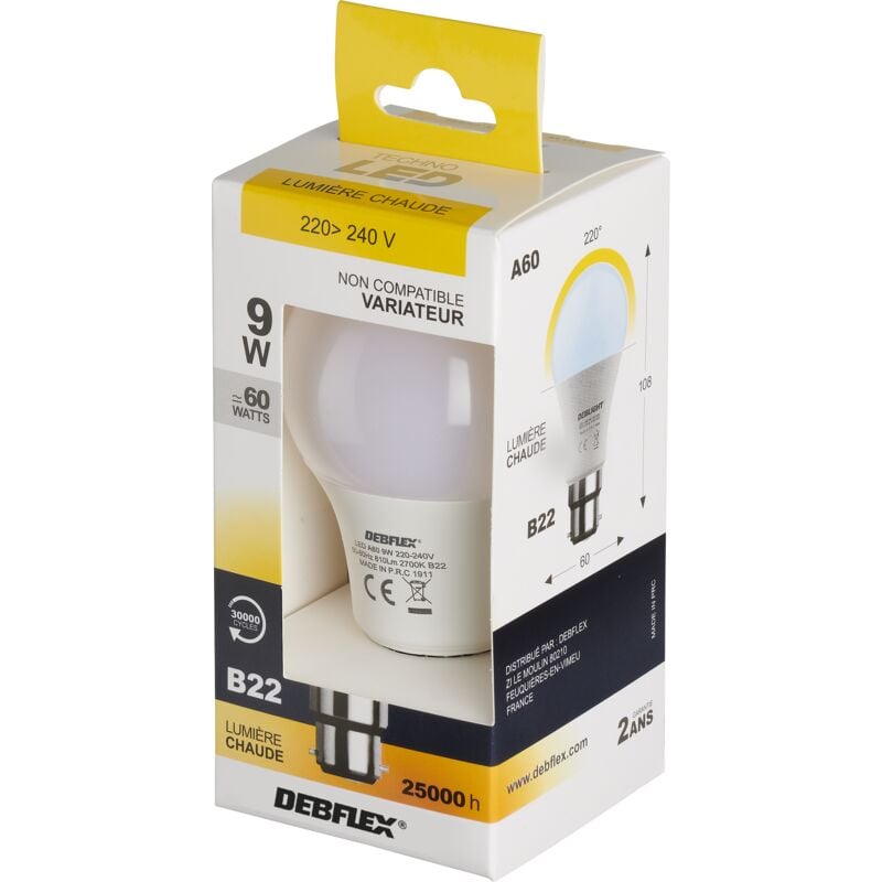 Découvrez AMPOULE A60 SMD VERRE BLANC B22 9W 2700K 810LM - DEBFLEX - 600434 disponible à l'achat