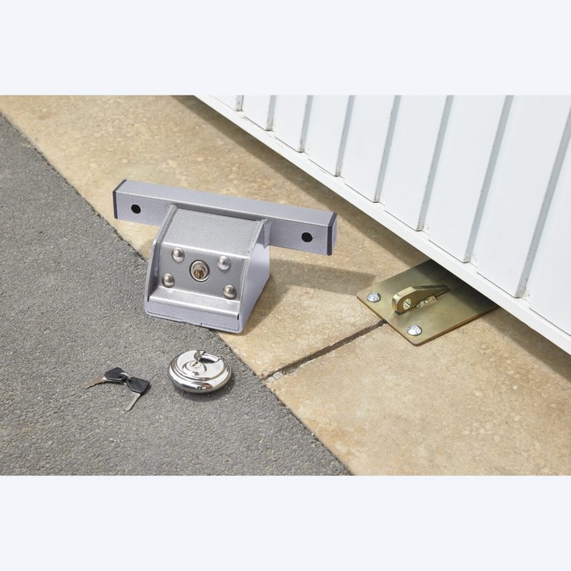 Ce butoir extérieur est fixé au sol et verrouillé par un cadenas Diskus, empêchant tout arrachement. Il s'adapte aux portes s'ouvrant verticalement grâce à deux boulons, tout en bloquant l'ouverture des modèles basculants avec débord. Deux butées intérieures renforcent la sécurité, et les flasques latéraux protègent le cadenas des chocs.