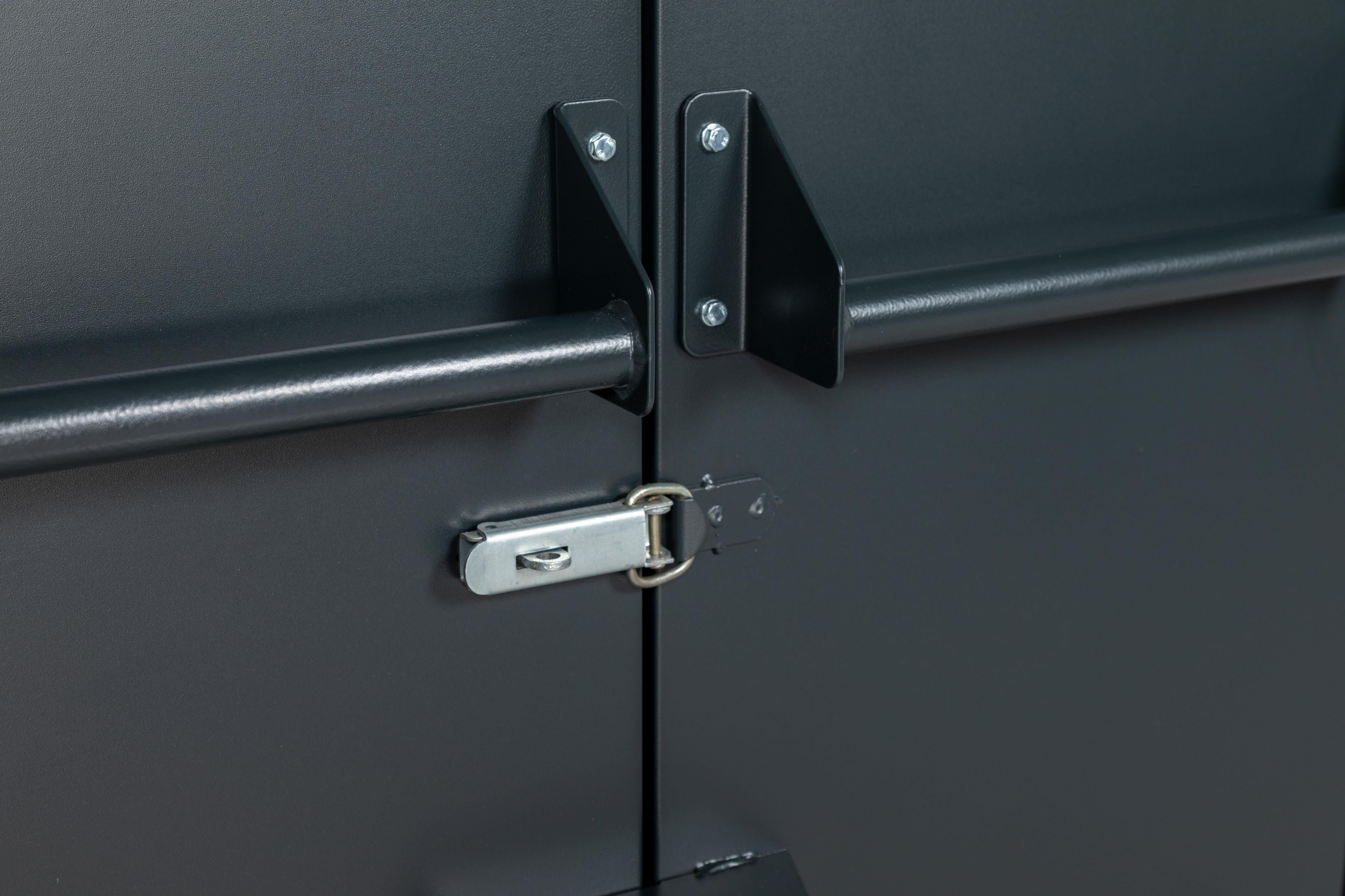 Fabriqué en acier durable de 1,5 mm et 2 mm, il est équipé d’un système de verrouillage de type cadenas-moraillon, éliminant ainsi le besoin de clés.