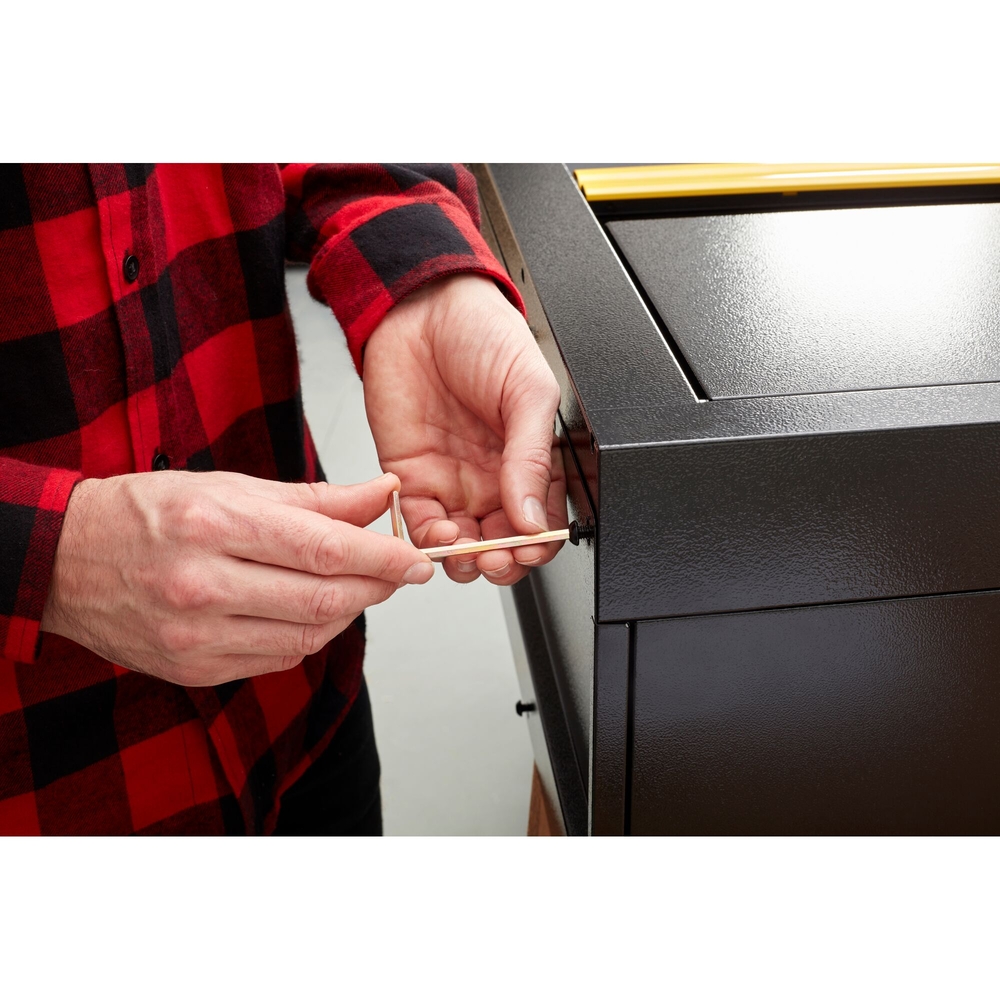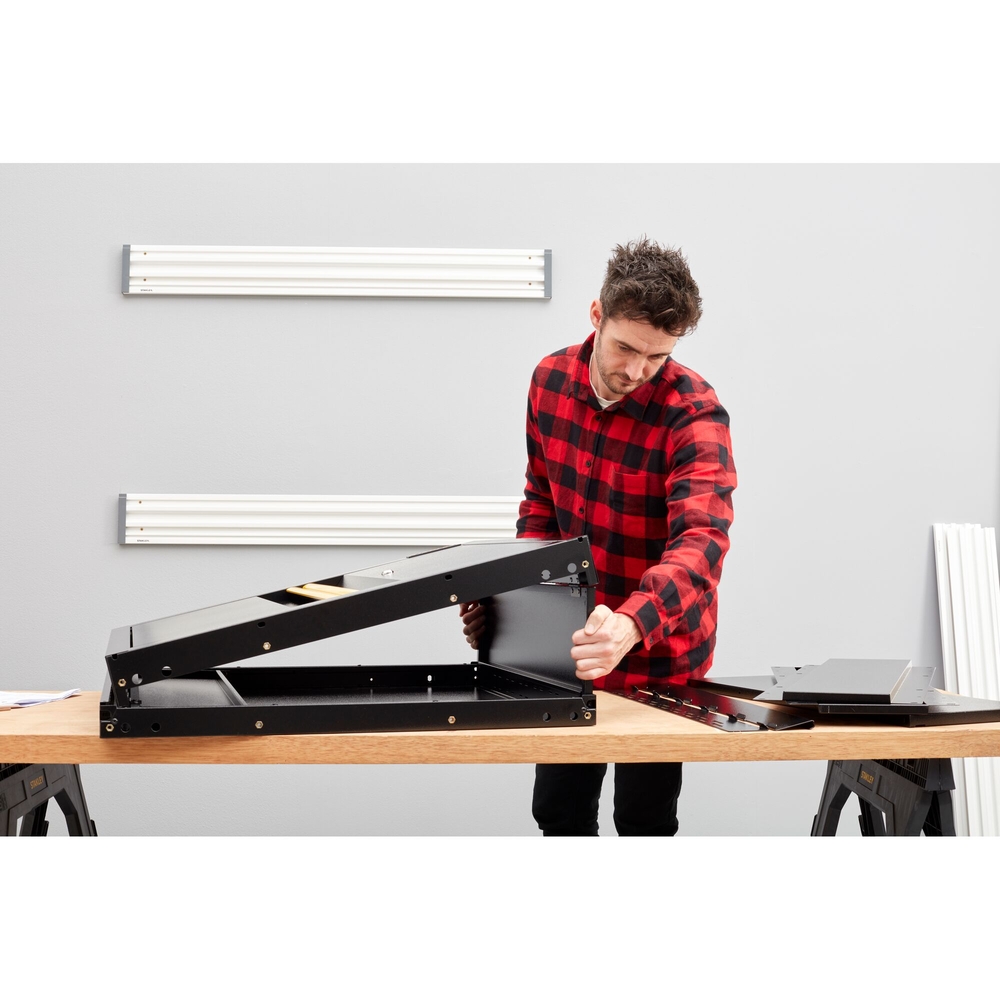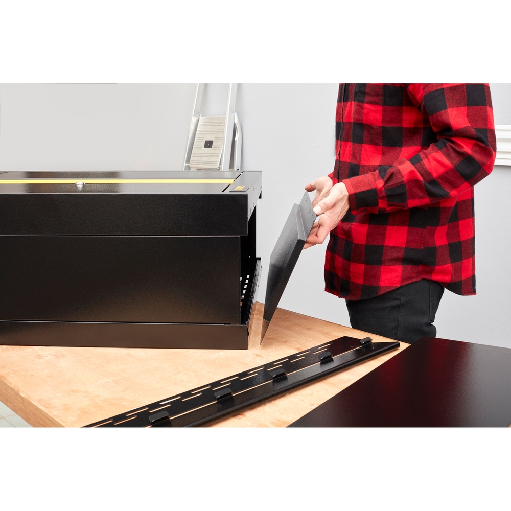 L'armoire est compatible avec la fixation sur cloisons sèches, montants muraux et murs en maçonnerie. Elle peut également être accrochée au système de rails Track Wall STANLEY® grâce à ses loquets à l'arrière, offrant ainsi une grande flexibilité d'installation.