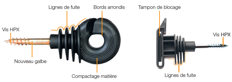 Point d’ancrage de la clôture, les isolateurs maintiennent le conducteur en place et garantissent la performance électrique de l’installation. Ils font partie intégrante du système de clôture et assurent sa résistance face aux conditions environnementales. Sans isolateurs de qualité, la plupart des piquets engendrent des pertes électriques significatives, et même le bois devient très conducteur en présence d’humidité (rosée, pluie, etc.). C’est pourquoi il est crucial de choisir des isolateurs performants pour conserver l’efficacité de votre clôture.