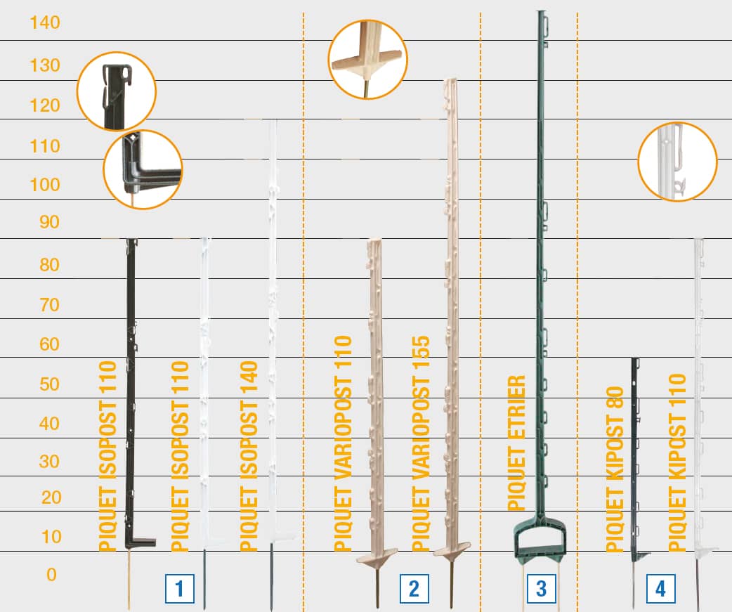 Piquet de clôture auto-isolant pour fil, cordon jusqu’à 6 mm et ruban jusqu’à 40 mm. La hauteur des passants permet d’assurer la garde de tous types d’animaux.