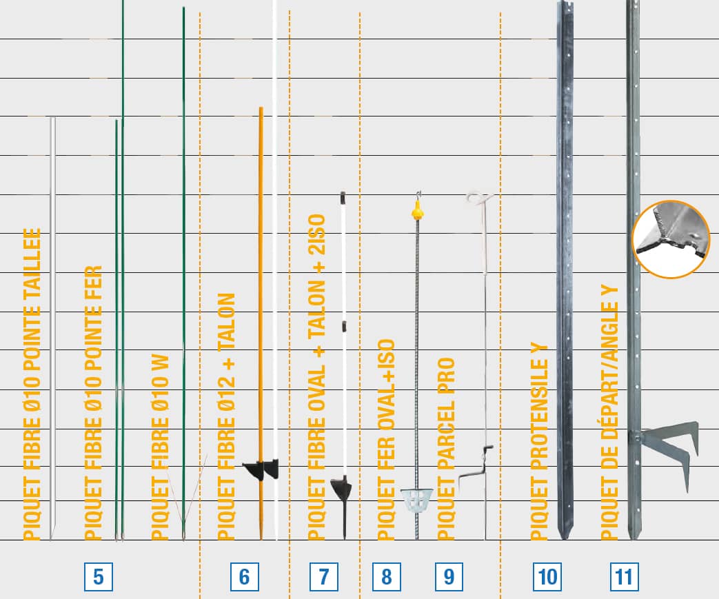 Le bois reste le piquet le plus utilisé pour des clôtures fixes et malgré la nécessité d’un outillage lourd pour l’installation. La meilleure alternative au bois, c’est le piquet protensile Y. Il s’utilise en clôture permanente mais peut également se déplacer. Il permet donc l’installation de clôtures fiables même sur des parcelles qui seront réorientées plus tard, ou pour faire de la protection de culture contre le sanglier. Les piquets fibre de verre ont de multiples facettes. Ils peuvent être utilisés aussi bien pour de la clôture permanente, avec notamment la clôture ACTIVE (Ø 10 mm), que pour du déplacement régulier (Ø 12 mm + talon). Ils ont l’énorme avantage d’être légers et faciles à transporter. Les piquets plastiques, quant à eux, sont appréciés pour leur praticité. Grande facilité d’utilisation, ils sont complets et prêts à l’emploi.