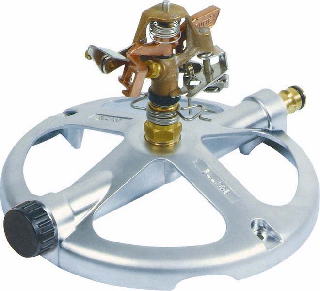 La surface couverte est circulaire et peut-être réglée par secteur (0 à 360°) à l'aide de deux bagues et d'une butée métalliques. La hauteur d'aspersion et la longueur du jet se règlent en actionnant manuellement le déflecteur en métal. Une petite vis permet de briser le jet pour une diffusion en pluie plus fine et plus éparse. La buse est démontable à l'aide d'une clé plate pour pouvoir la nettoyer.