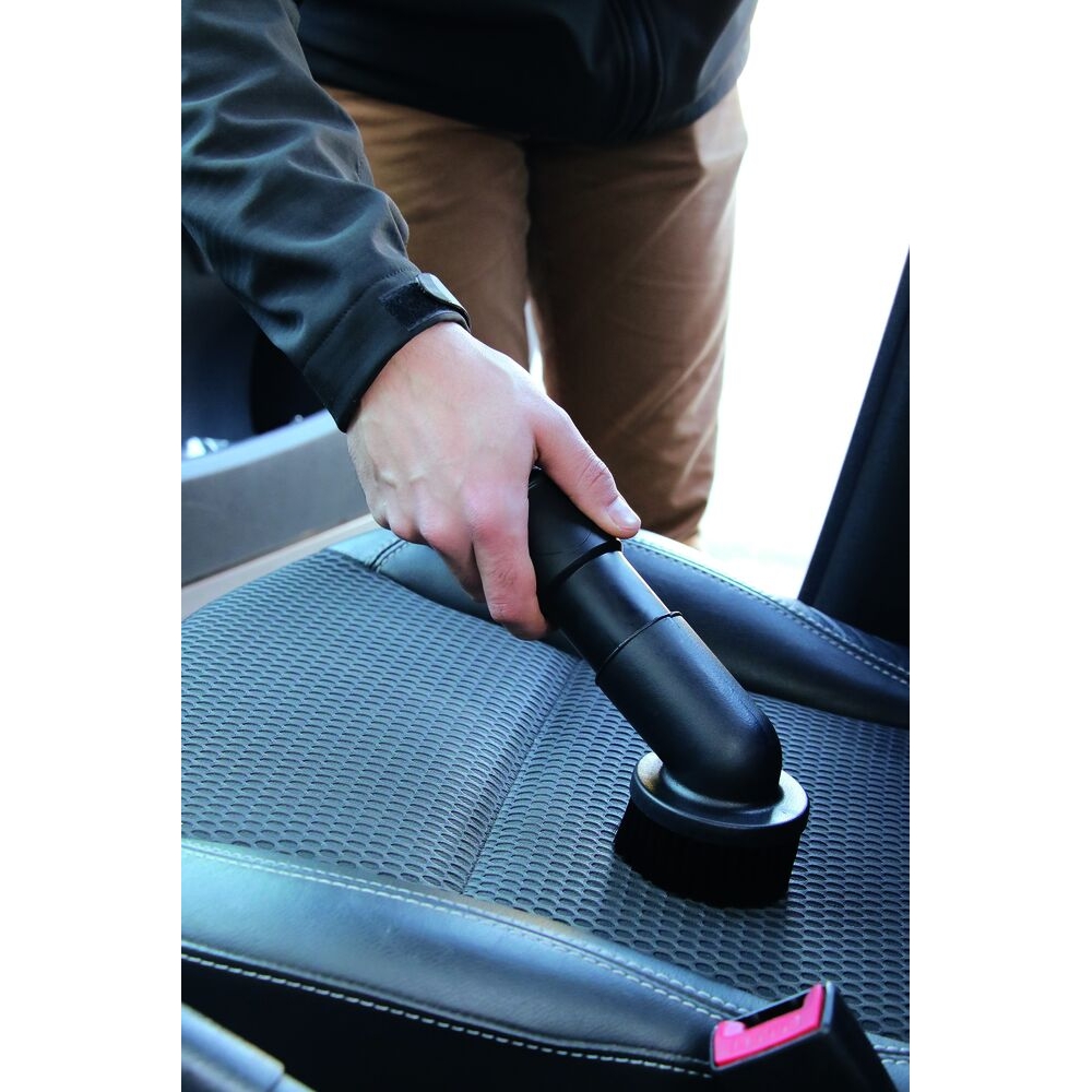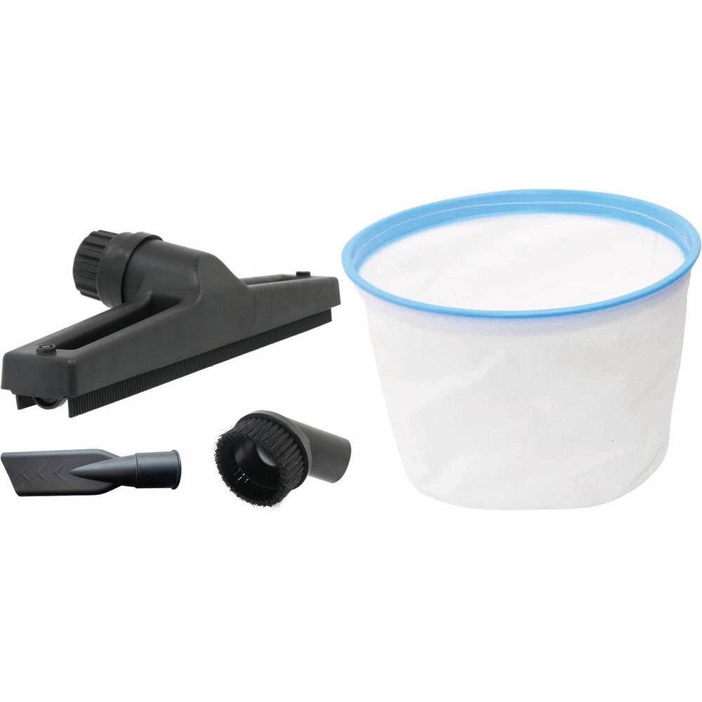 Le kit complet comprend une brosse ronde, un suceur plat pour sol et moquette, un suceur plat pour eau, un suceur biseau, un filtre textile, deux tubes acier chromé en S, et un flexible de 2,5 m. Ces accessoires assurent une polyvalence pour diverses applications de nettoyage sur chantier.