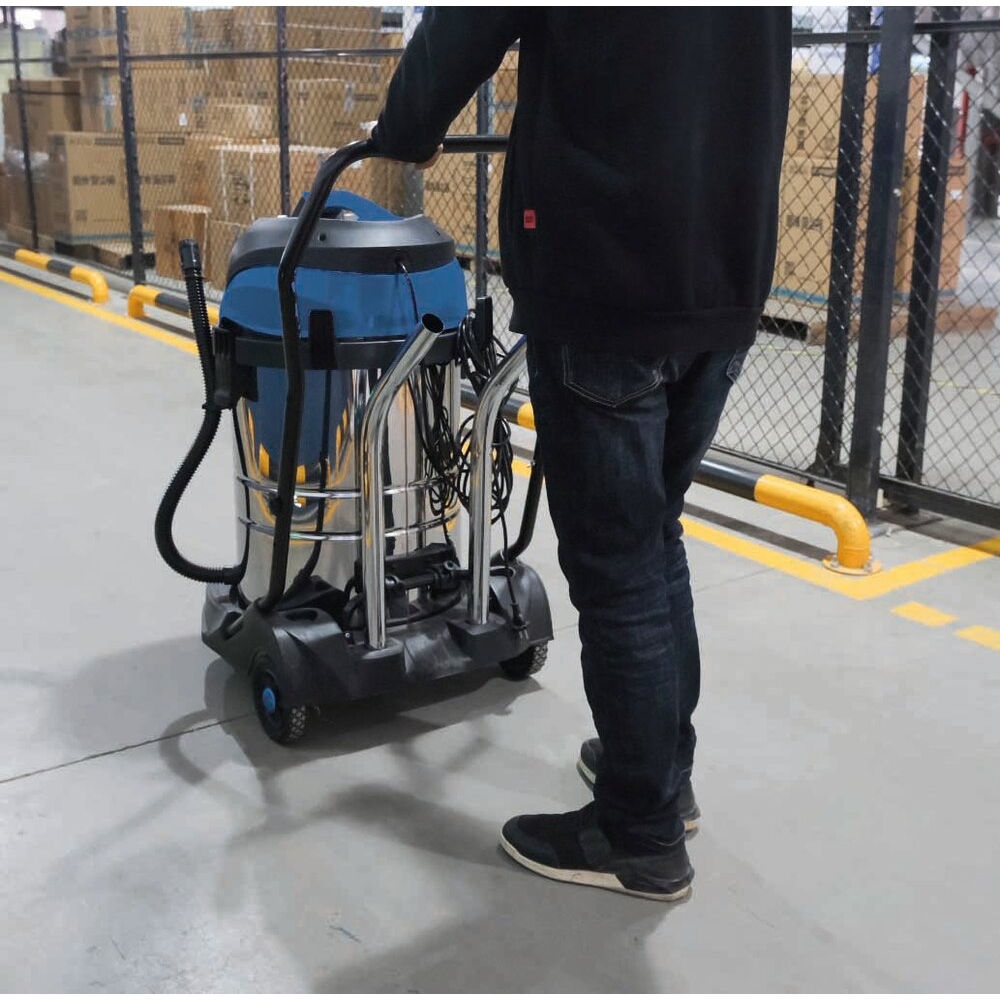 L'aspirateur dispose d'une cuve en inox d'une capacité de 60 litres, avec un système basculant facilitant la vidange. Cette cuve métallique assure robustesse et longévité.