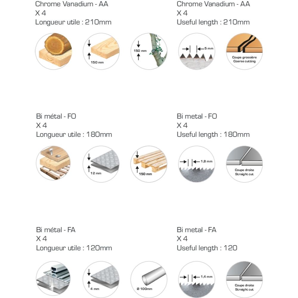 Les dimensions des lames sont variées, avec une longueur de 210 mm pour les lames destinées au bois, 180 mm pour le bois-métal-plastique, et 120 mm pour l'inox. Dans chaque segment, vous trouverez 4 lames de chacun des matériaux. Livrées en blister, ces lames sont idéales pour tous vos travaux de bricolage et professionnels. Faites le choix de la qualité pour une découpe sans compromis.