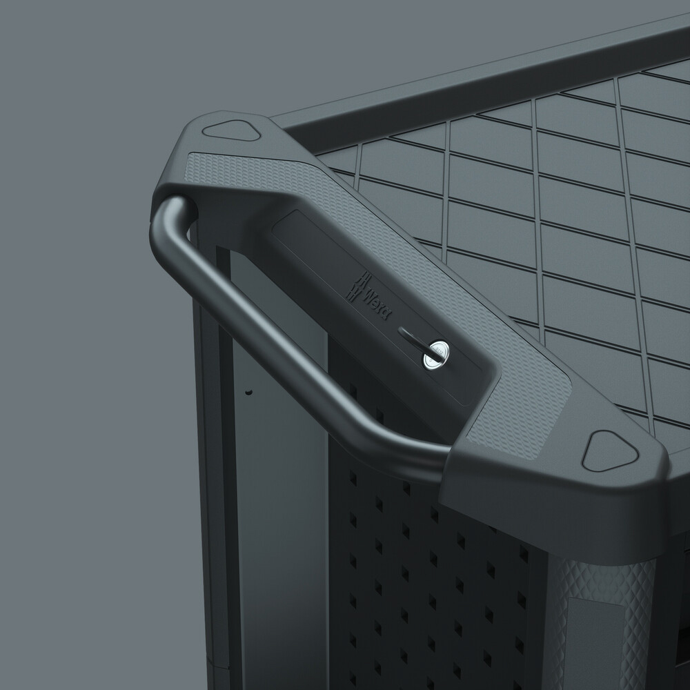 La position latérale ergonomique de la serrure facilite son utilisation et protège la clé et la serrure contre les dommages. Grâce au système de verrouillage extrêmement robuste, les outils rangés dans la servante d'atelier sont protégés de manière sûre contre tout accès non autorisé. Le verrouillage centralisé est assuré par une serrure à barillet. Deux clés pliantes sont fournies.