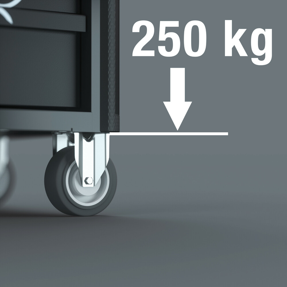 La servante d'atelier Tool Rebel est équipée de grandes roulettes pouvant supporter 250 kg chacune avec des roulements à billes de précision et double cage à billes dans le palier d'articulation. La servante d'atelier se manie facilement même avec une forte charge dynamique.