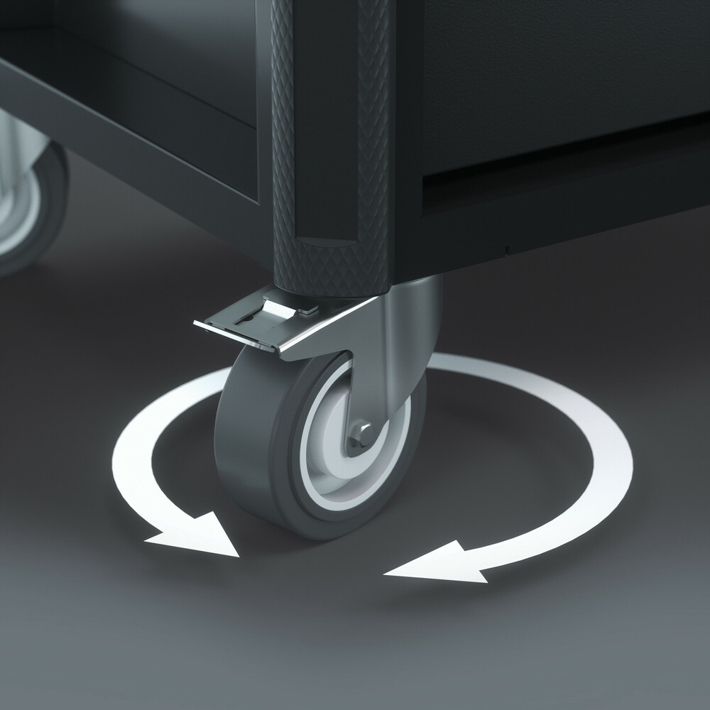 Les 2 roulettes pivotantes sont équipées d'un blocage double : le frein de la roulette empêche efficacement tout déplacement intempestif, le frein du palier d'articulation empêche la rotation non désirée des roulettes pivotantes, par ex. sur les surfaces en pente. Les roulettes élastiques résistantes aux huiles et aux acides permettent un roulement silencieux. Un anneau de protection empêche la saleté et les fils de pénétrer.