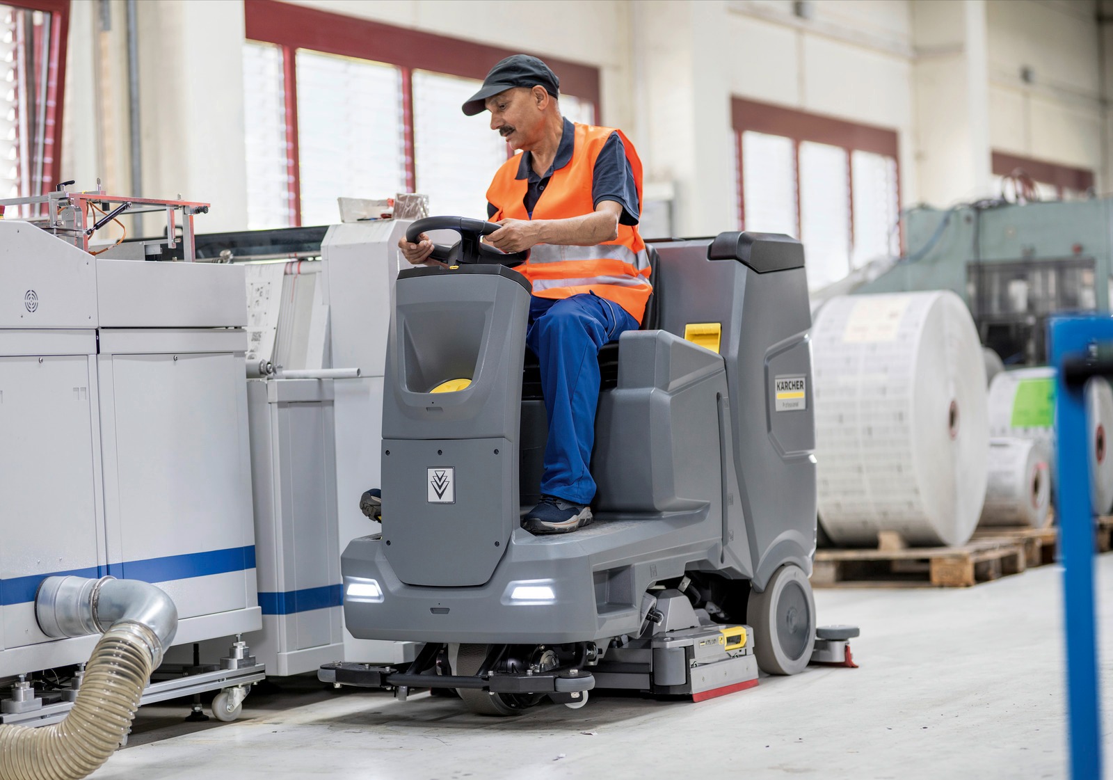 Le grand afficheur multilingue (plus de 30 langues) et les commandes à code couleur facilitent la prise en main et l'utilisation. La machine dispose également de feux de jour pour la sécurité de l'utilisateur et de son environnement. La largeur d'allée nécessaire pour un demi-tour est de 175 cm. Le niveau sonore est de 59 dB (A), et le poids de l'appareil sans accessoires est de 379 kg. Ses dimensions sont de 1635 mm de longueur, 975 mm de largeur et 1265 mm de hauteur.