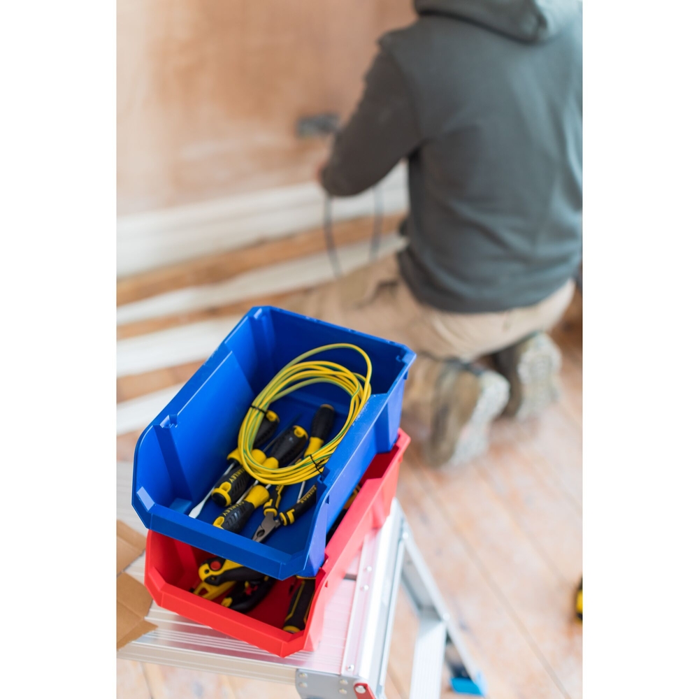 Il est conçu pour être empilable et emboîtable, permettant un gain de place important. Son ouverture large facilite l’accès rapide aux éléments stockés, améliorant ainsi la gestion des outils et fournitures.