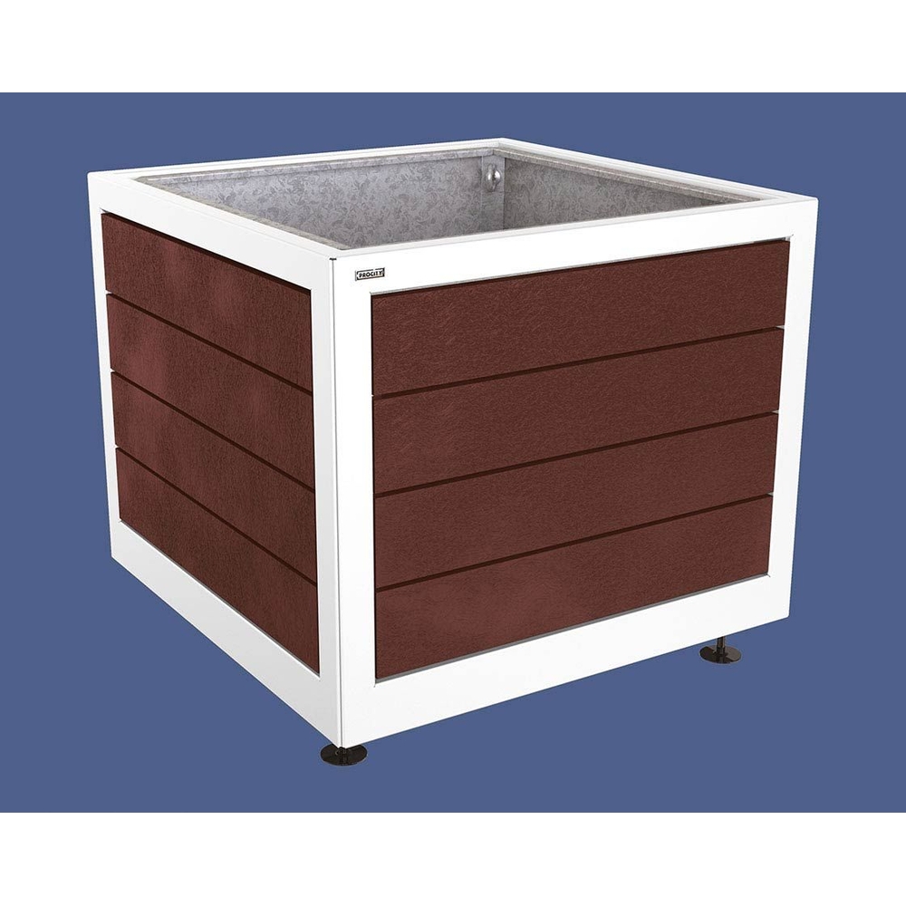 Les grandes caractéristiques techniques incluent des dimensions généreuses de 1000 mm de longueur, 1000 mm de largeur et 800 mm de hauteur. Le châssis en acier galvanisé est peint selon une large gamme de coloris, tandis que l'habillage en plastique recyclé marron, d'une épaisseur de 25 mm, assure une excellente durabilité et esthétiquement plaisante. Ce bac allie donc fonctionnalité, style et écologie pour un aménagement extérieur réussi.