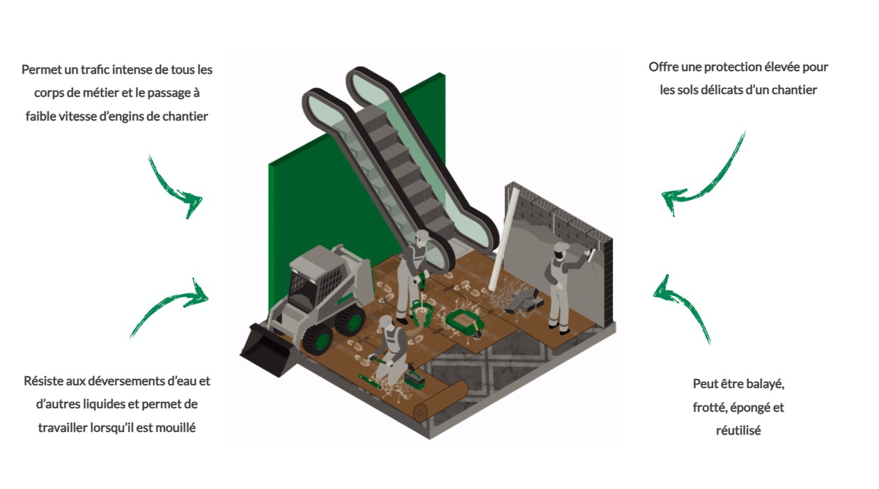 Elle constitue une protection idéale pour les sols délicats dans diverses zones, assurant durabilité et efficacité dans des conditions de chantier exigeantes.