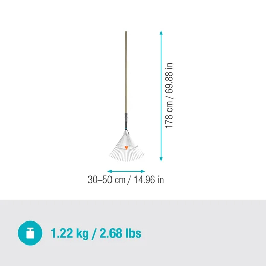 Le balai à gazon réglable NatureLine GARDENA est idéal pour balayer les feuilles mortes, l'herbe coupée et autres déchets du jardin (grossiers et fins). Il est doté d'un manche bois de hêtre verni (certifié FSC®) très qualitatif et résistant et d'une tête d'outil en acier trempé zingué. Le manche est doté d’un trou à sa base pour permettre un stockage facile. L'écartement des dents s'ajuste facilement entre 30 et 60 cm grâce à la molette. Son emmanchement est particulièrement solide et stable, l'utilisateur est assuré qu'il n'y aura pas de jeu avec le temps. C'est un outil fiable, confortable et durable dans le temps. garantie commerciale 10 ans.