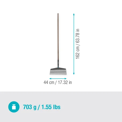 Le balai-râteau NatureLine GARDENA est idéal pour ratisser les feuilles mortes, l'herbe coupée ou autres déchets dans le jardin. Il est doté d'un manche bois de hêtre verni (certifié FSC®) très qualitatif et résistant et d'une tête d'outil en plastique de haute qualité. Le manche est doté d’un trou à sa base pour permettre un stockage facile. Son emmanchement est particulièrement solide et stable, l'utilisateur est assuré qu'il n'y aura pas de jeu avec le temps. C'est un outil fiable, confortable et durable dans le temps. garantie commerciale 10 ans.