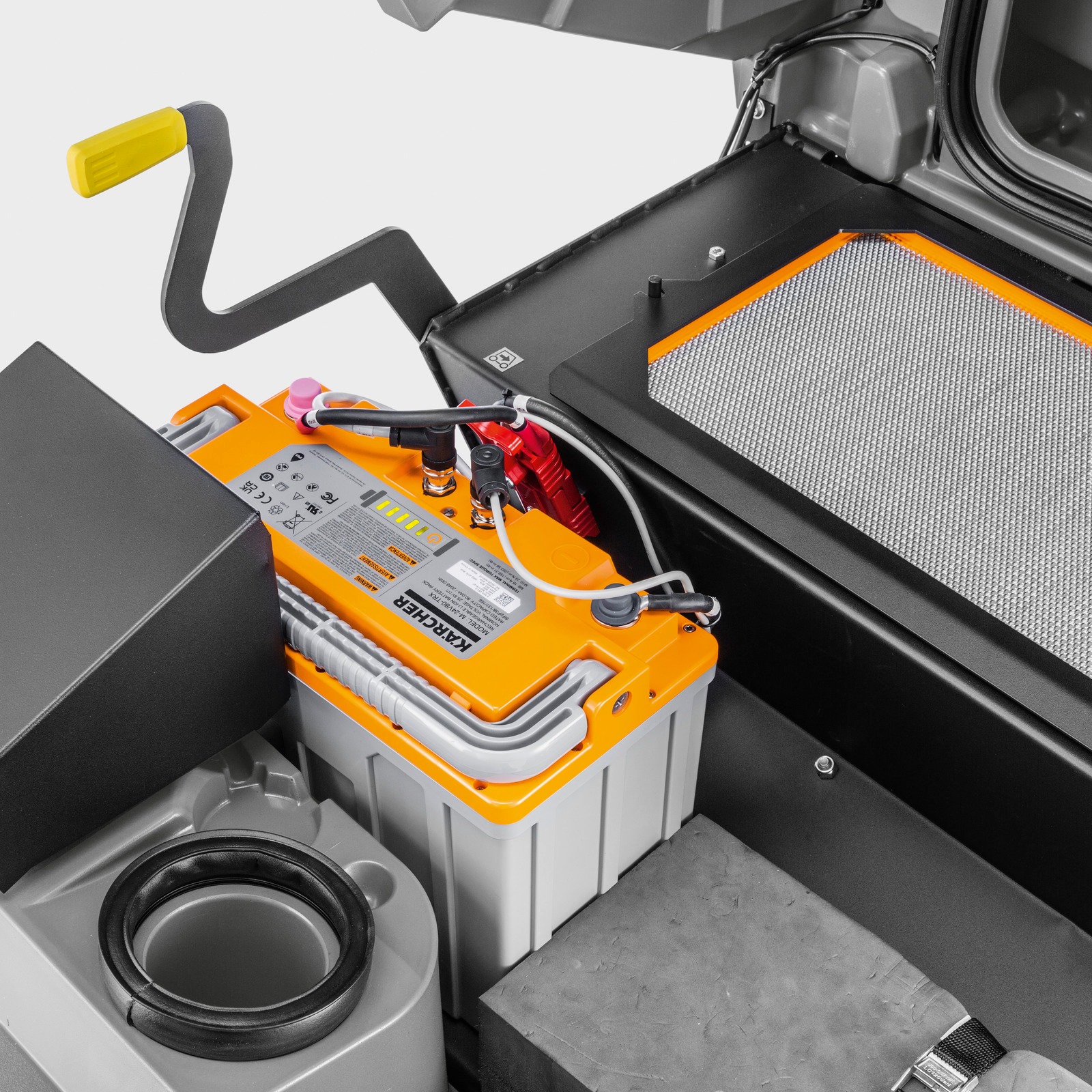 La balayeuse autoportée KM 85/50 R Bp Pack convainc de par son excellent équipement. La batterie Lithium-ion de 80 Ah et le chargeur rapide sont fournis de série, de même qu'une brosse latérale avec réglage de la vitesse, un grand filtre antipoussière et un indicateur d'usure pour le balai principal clairement visible de l'extérieur. La conception très compacte de la machine garantit une grande maniabilité, ce qui permet également son utilisation dans des zones restreintes et encombrées. En outre, la balayeuse autoportée KM 85/50 R Bp Pack impressionne par des performances élevées à l'intérieur comme à l'extérieur. Son fonctionnement ainsi que son entretien sont extrêmement simples. Le remplacement du balai principal est possible sans outil. Le balai flottant n'a pas besoin d'être réajusté et il élimine efficacement la saleté des sols irréguliers. Les composants de la machine sont simples d'accès grâce à un couvercle doté d'une large ouverture et aucun outil n'est nécessaire pour l'ouvrir. L'utilisateur peut nettoyer le filtre à poussières depuis son siège. Des accessoires de nettoyage supplémentaires peuvent être transportés avec le système Home Base intégré.
