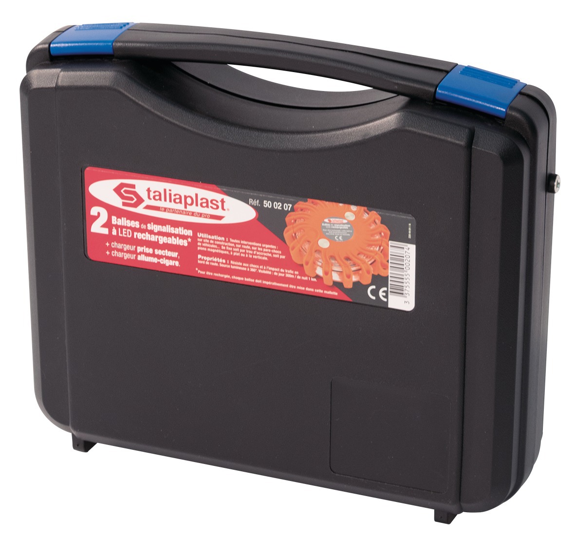 Balises de signalisation à LEDS rechargeables. Elles sont livrées avec une mallette de stockage mais aussi de chargement (temps de chargement 4 à 5 heures). Ces balises peuvent garder la charge jusqu'à 90 jours. Source lumineuse à 360°. Chaque balise (200 g) possède 16 LEDS. Elle se fixe soit par trou d'accroche soit par pions magnétiques. Visibilité jour : 300 m, nuit : 1 km. Autonomie varie selon mode utilisé - il existe 9 modes différents (jusqu'à 21 h en simple flash). Étanche à la poussière et eau (jusqu'à 1 m de profondeur). Existe en mallette de 2 ou 6 pièces. Contenu de la mallette : balises, 1 chargeur prise secteur, 1 chargeur allume cigare. (Poids de la mallette 6 pièces complète : 3,2 kg). Garantie 1 an.