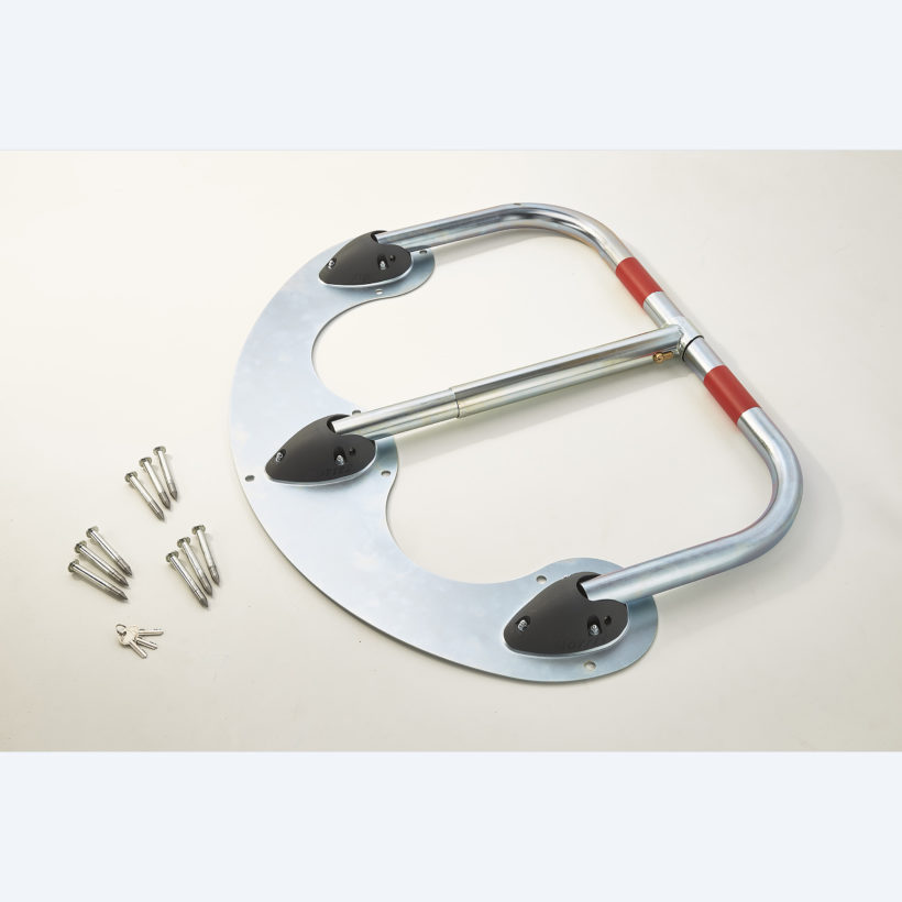 Avec un tube de 50 et 45 mm de diamètre, elle dispose d'une serrure canon européen et se verrouille automatiquement. Résistante, elle soutient jusqu'à 1 200 kg à l’arrachement et 5 000 kg à l’écrasement. Le kit comprend 9 clous de 12 mm de diamètre, une platine de 102 x 46 cm et une tôle de 3 mm d'épaisseur, garantissant une fixation solide au sol.