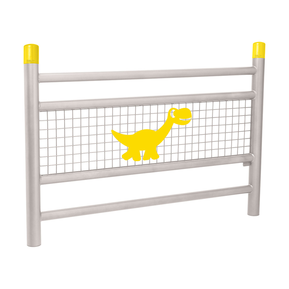 Mesurant 1572 mm de longueur et 1100 mm de hauteur hors sol, la barrière est construite en acier peint sur zinc. Son grillage composé de mailles carrées en fil de 4 mm assure une robustesse remarquable. Les poteaux, en tubes acier de 76 mm de diamètre, garantissent une excellente stabilité. La garde au sol est de 150 mm, et les animations sont réalisées en tôle d'acier galvanisée de 3 mm. Les couleurs vives des animations, telles que "Dino" en RAL 1021, "Serpent" en RAL 3020 et "Croco" en RAL 6018, ajoutent une touche ludique tout en maintenant une cohérence esthétique avec les pommeaux. Une version bicolore sans animations est également disponible.