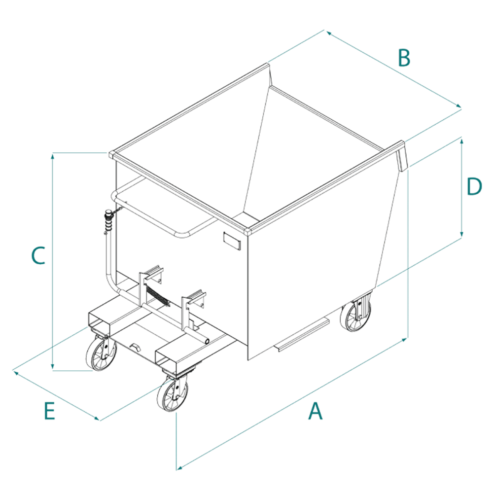 Ses dimensions sont précisément les suivantes : longueur totale (A) 1 610 mm, largeur (B) 1 345 mm, hauteur extérieure (C) 1 195 mm, hauteur utile de basculement (D) 1 045 mm, et hauteur intérieure (E) 800 mm. Le poids total de la benne est de 195 kg. Elle est également munie de roues pour faciliter ses déplacements sur site.