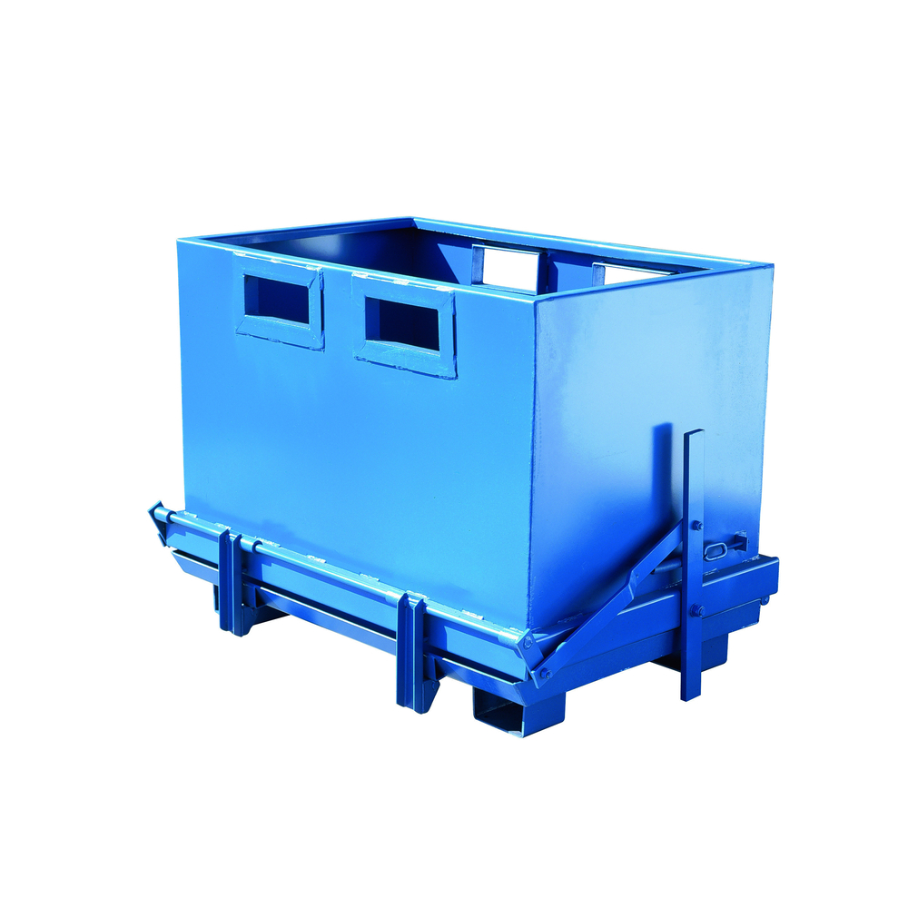 Ouverture automatique et verrouillage après vidage. Le vidage doit s'effectuer par gerbeur à contrepoids ou avec stabilisateurs. Finition peinture époxy bleu. Empilable pour un gain de place. Livré prêt à l'emploi.