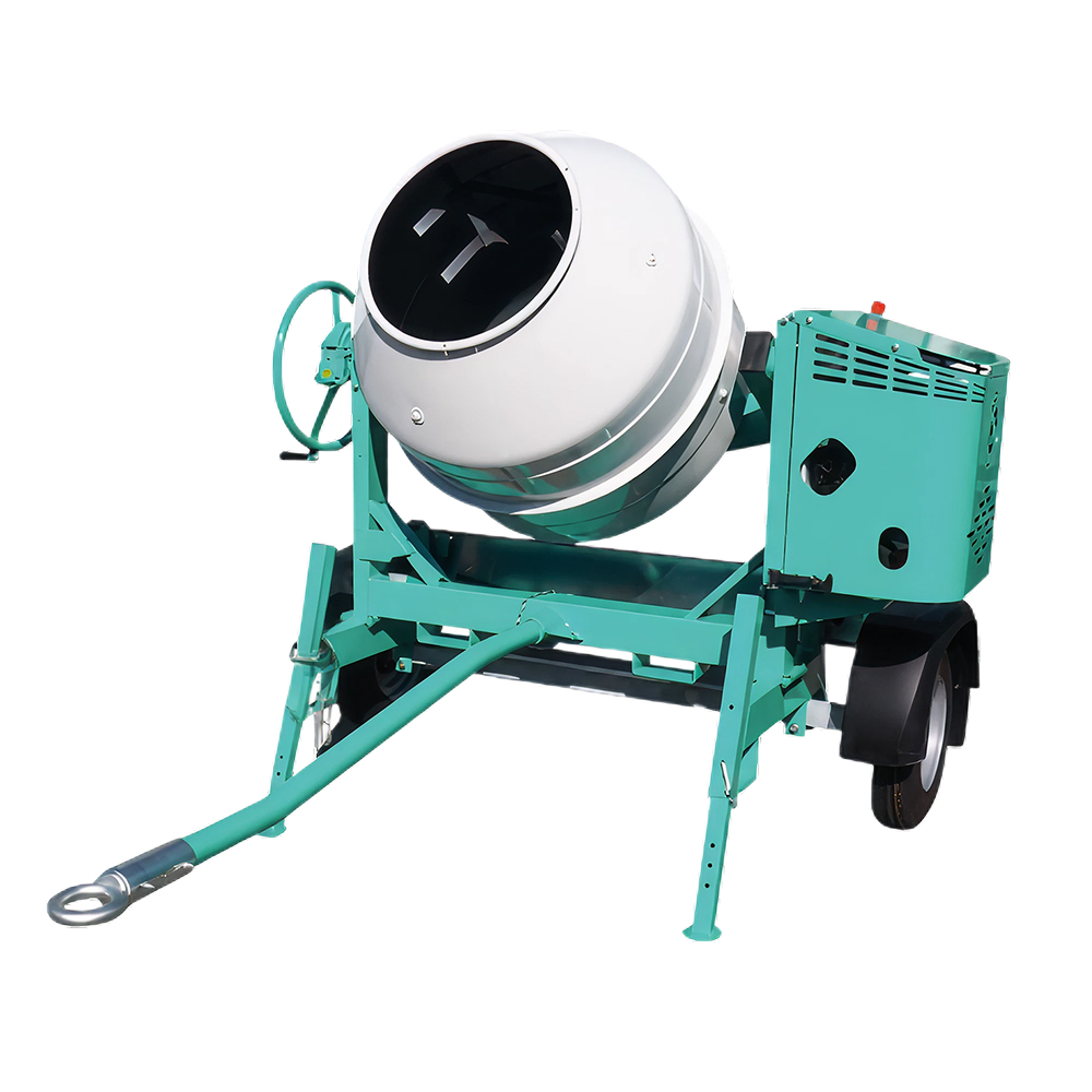 Le châssis démontable en plusieurs parties facilite la réparation et l’entretien. La bétonnière est montée sur des roues gonflables de 135 mm (10 pouces) avec suspensions à barre de torsion, offrant stabilité et confort de transport. Le timon est réversible en deux positions avec une tête interchangeable, et une attache à boule est disponible en option. Les gardes-boues protègent les roues. L’appareil est tractable jusqu’à 90 km/h.