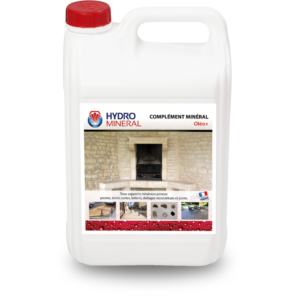 Le Bidon Complément minéral OLEOPLUS Hydrofuge Tous Supports 5 L HYDRO MINERAL - MOEN5 est une solution innovante conçue pour la consolidation et l'imperméabilisation des supports minéraux poreux. Grâce à son fort pouvoir de minéralisation, il assure une protection efficace contre les graisses et les taches, tout en préservant l'aspect naturel des matériaux traités.