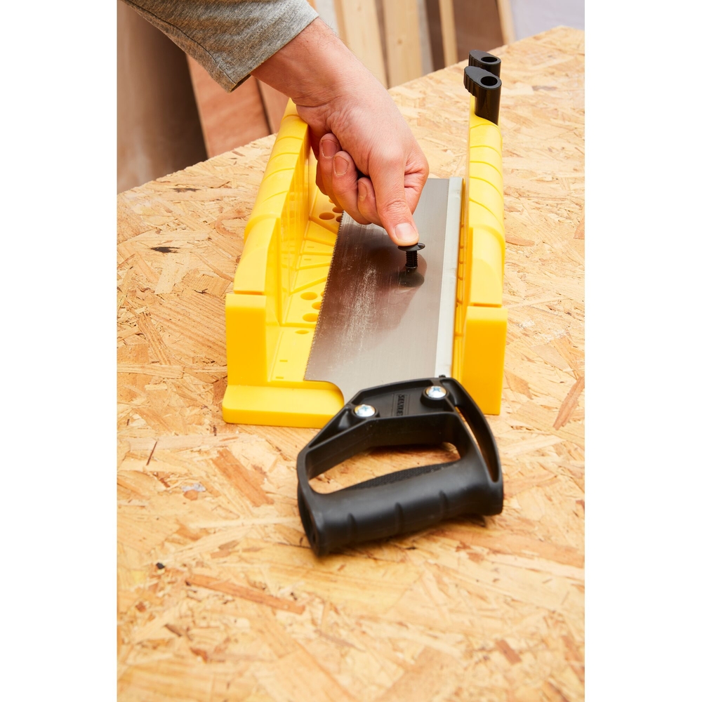 La boîte est moulée par injection d'une seule pièce, assurant solidité et durabilité. Elle est livrée avec une scie à dos à denture fine de 11 dents par pouce et d'une longueur de 300 mm. De plus, des compartiments intégrés permettent un rangement pratique des cales et des crayons. Des trous de fixation sont également présents pour la fixation de la boîte sur un établi, tandis que ses pieds pliables offrent la possibilité de l'utiliser à plat sur le sol ou l’établi, ou en butée sur un bord de table. Cette boîte à coupe est parfaite pour les travaux sur baguettes et moulures, offrant une expérience de bricolage optimale.