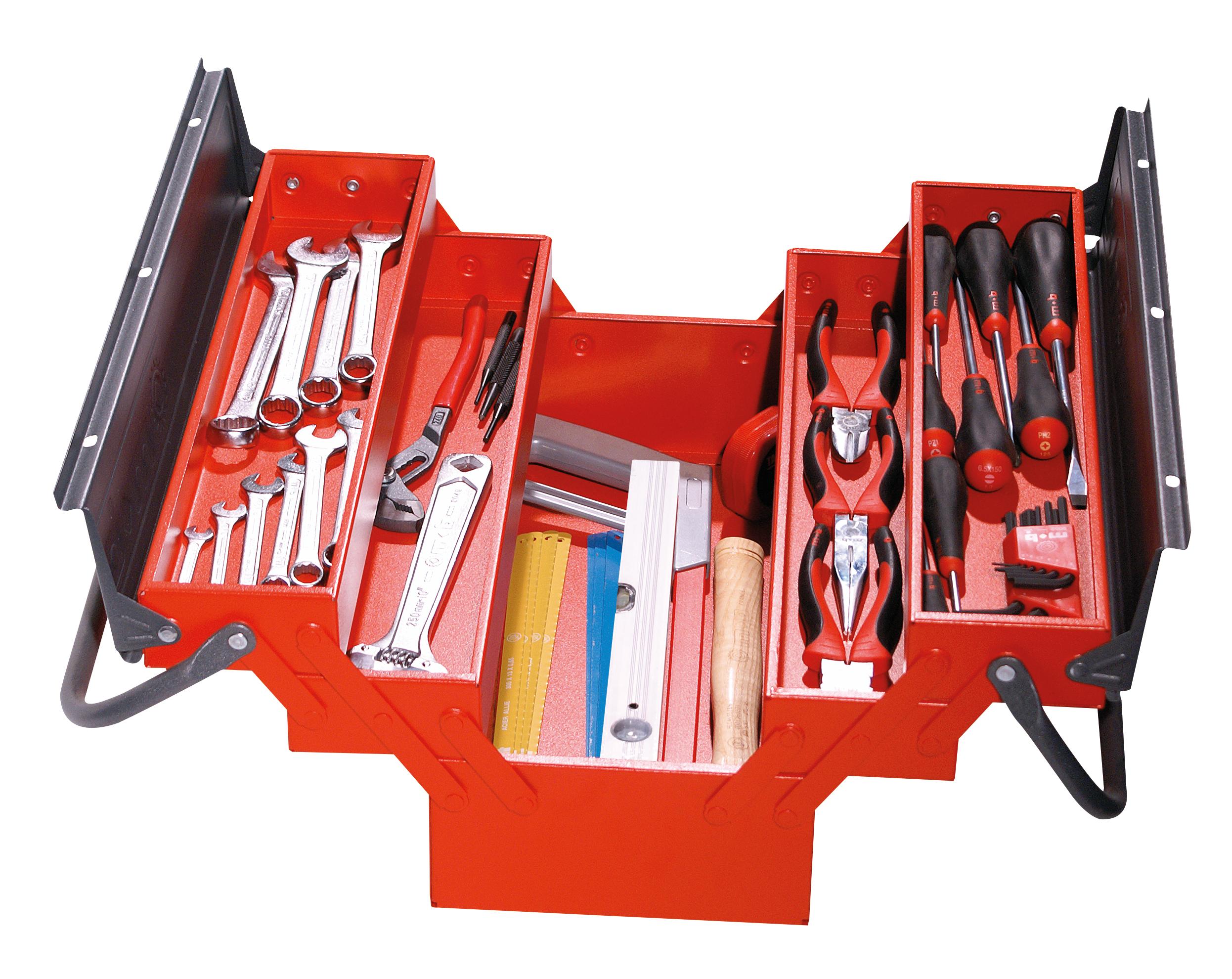 BOÎTE À OUTILS 5 COMPARTIMENTS BICOLORE. RESISTANCE : Rivets renforcés. Caisson rigide. Poignées tubulaires ergonomiques. Peinture époxy pour une meilleure durabilité. PRATIQUE : Fermeture par cadenas possible. Grande ouverture. Ouverte, ne bascule pas.Tapis dans chaque compartiment. Composition : 9 clés mixtes : 8-1-11-12-13-14-16-17-19 mm // 1 clé à molette 25 mm // 8 tournevis : 4 fentes : 4x1-5,5x1-6,5x15-8x15 mm / 2 Phillips : PH1 – PH2 / 2 Pozidriv : PZ1 – PZ2 // 9 clés mâles : 1,5-2-2,5-3-4-5-6-8-1 mm // 1 pince coupante 16 mm // 1 pince universelle 18 mm // 1 pince à bec demi-rond 2 mm // 1 pince multiprise superposée 24 mm // 1 monture de scie // 5 lames de scie carbon + 5 lames HSS // 1 mesure 3 mètres // 1 niveau rectangulaire de 4 cm // 1 marteau rivoir manche frêne 32 mm // 1 pointeau 6 mm // 3 chasses-goupilles : 3-4-5- mm // 1 lime mi-ronde 2 mm