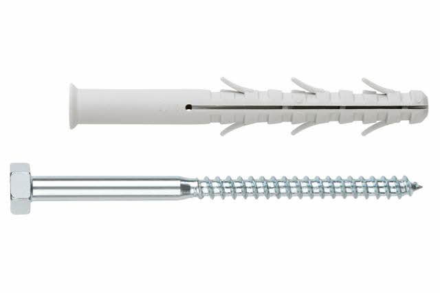 Chevilles plastiques. Cheville à frapper polyamide 6.6 Cheville à six ailettes avec vis tête hexagonale (10 x 100 Ø10 100 uds.) Fabriqué en nylon;Revêtement: zingué. Utilisation recommandée sur: béton, béton creuse, béton cellulaire, brique pleine, brique d'adobe, brique creuse, pierre... entre autres. Recommandé pour l'installation de climatisation, fixation espaliers, fixation étagère, fixation extincteur, fixation étendoir, placard cuisine, banc de parc, rambarde... entre autres. (Ref: TC6E10100, EAN: 8423533089250, INDEX Fixing Systems)